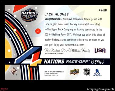 2025-26 SP Game Used '25 4 Nations Face-Off Fabrics #4NHU Jack Hughes JERSEY