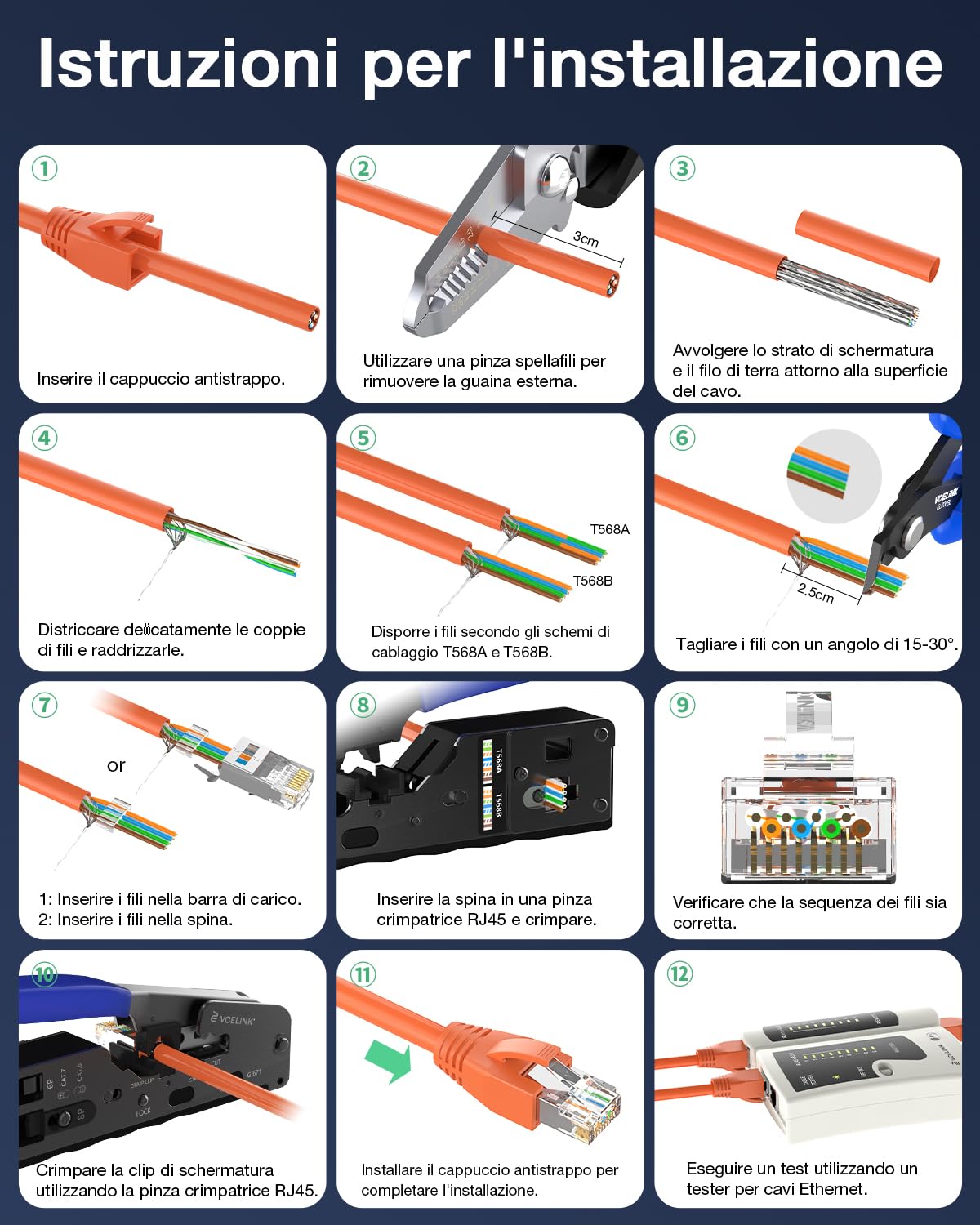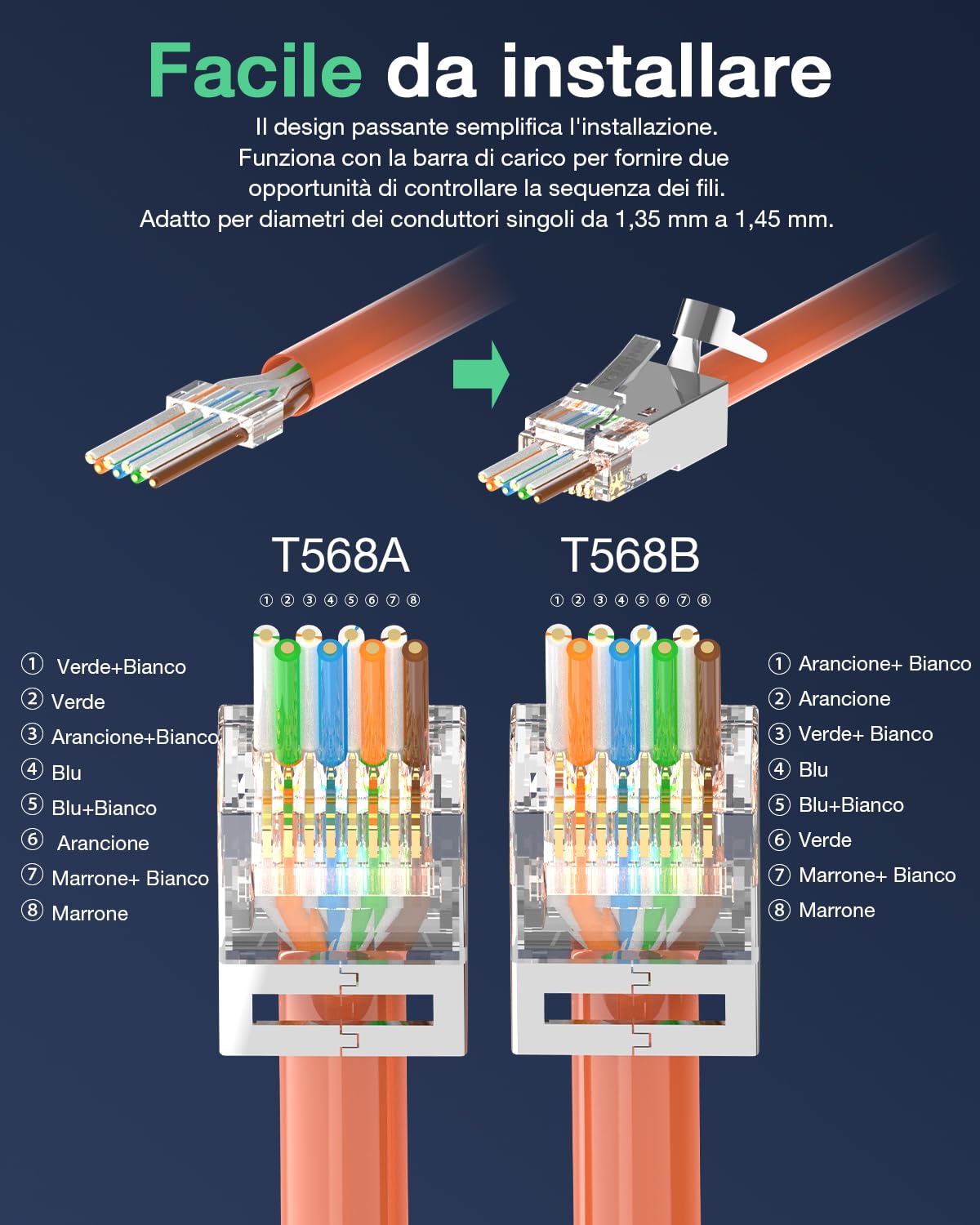 DESIGN PASSANTE: L'ordine dei cavi può essere controllato due volte attraverso il design pass-through del connettore. Quindi il processo di montaggio è molto più semplice rispetto al tipo tradizionale, riducendo il tasso di errore. È necessaria una pinza crimpatrice professionale RJ45