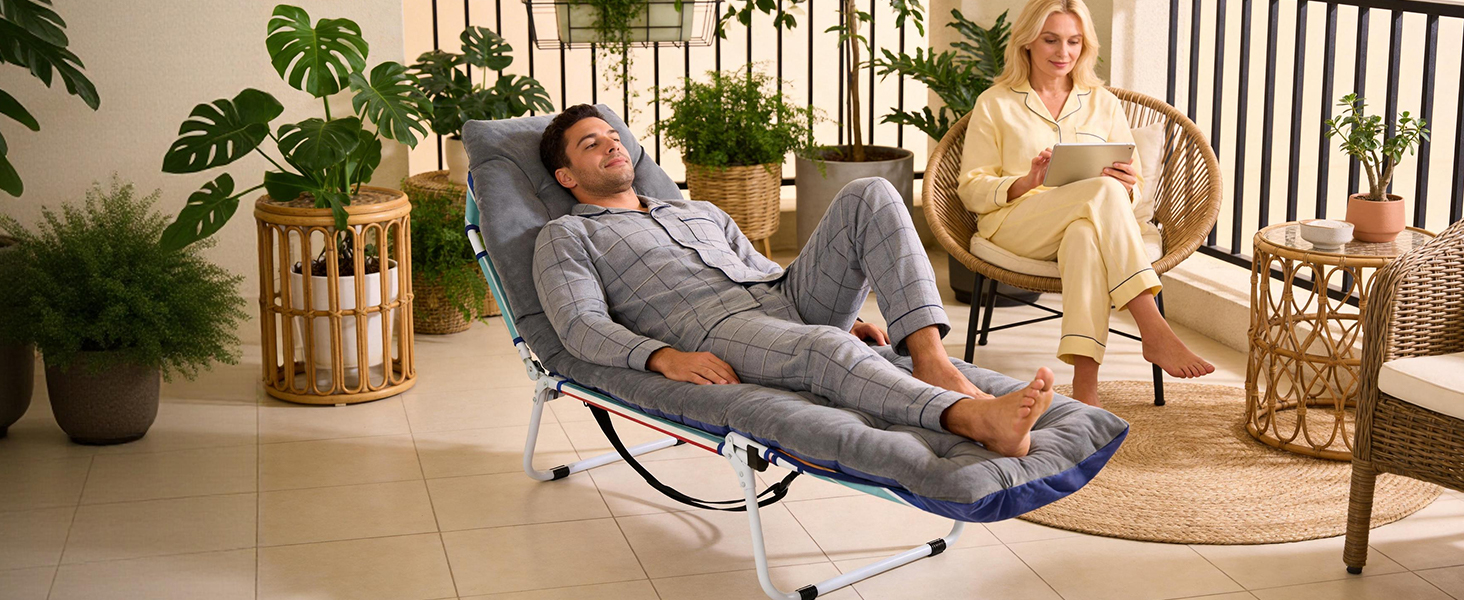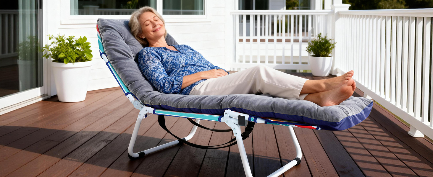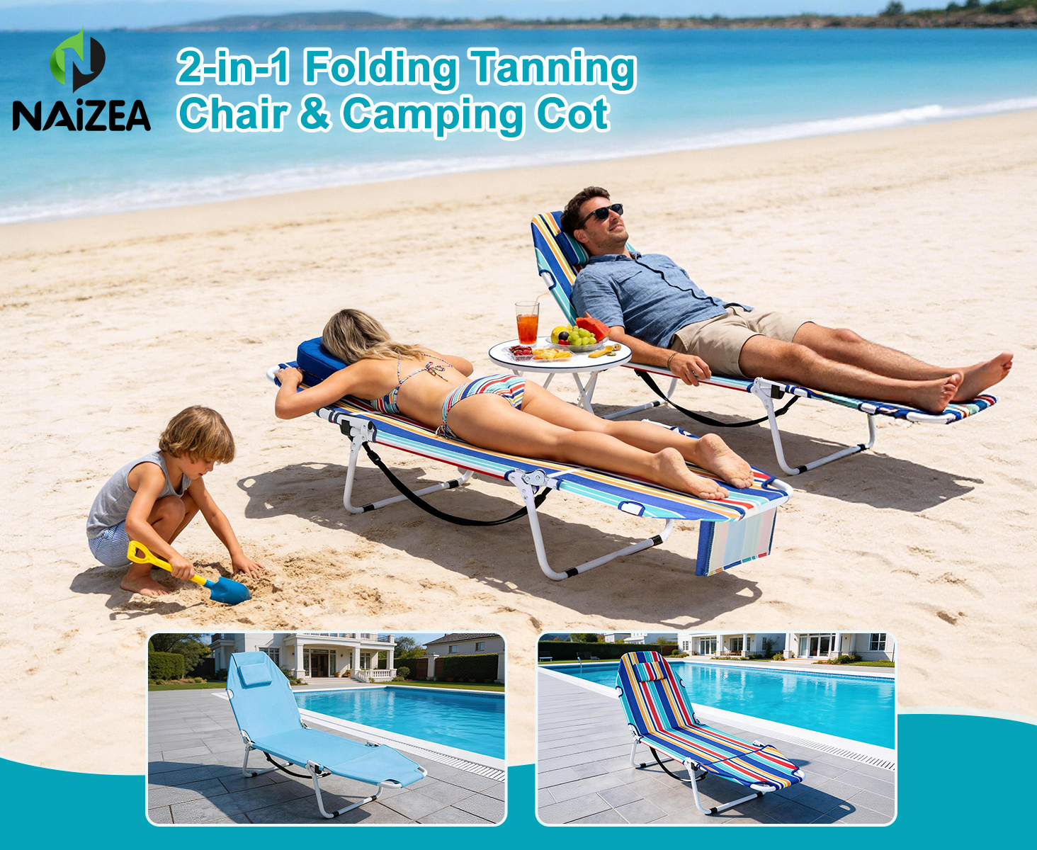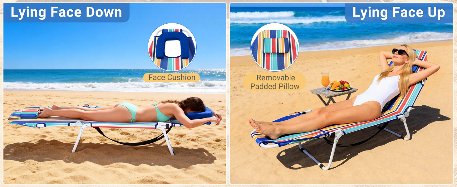 【TANNING CHAIR WITH FACE OPENING】Designed with a unique face opening, this tanning chair allows you to lie face down comfortably without pressure on your neck or head. The padded face cushion provides soft, supportive comfort, and the opening can be covered or uncovered as needed