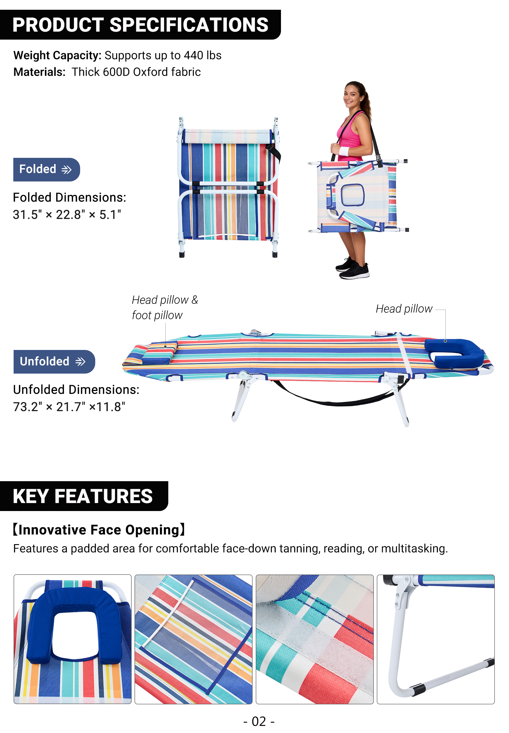 【HEAVY-DUTY & SUPPORTIVE DESIGN】Built for durability and stability, this face-down tanning chair supports up to 440 lbs. Made with upgraded 600D Oxford fabric and PU coating, it offers a soft, breathable surface that enhances comfort during extended use