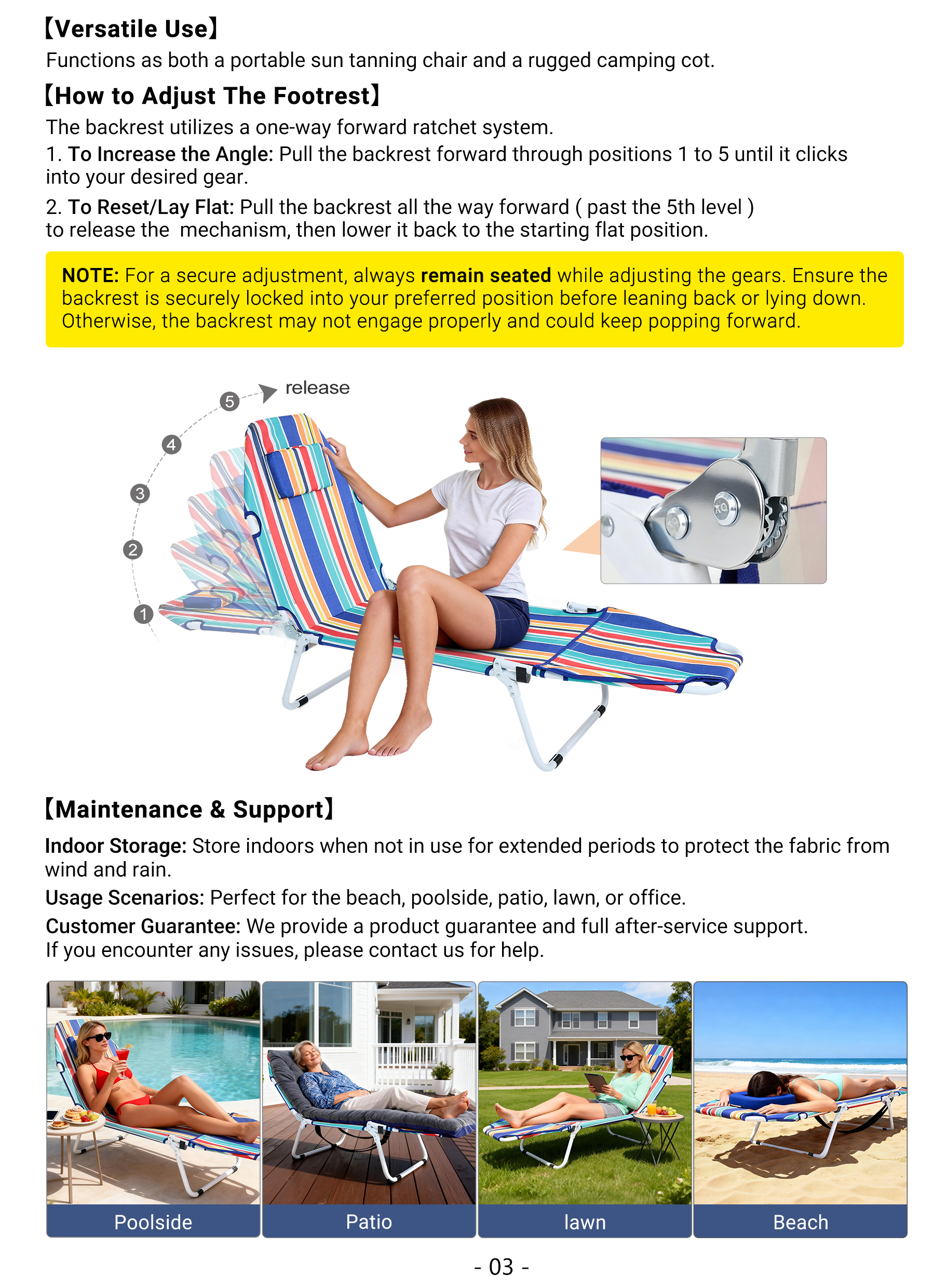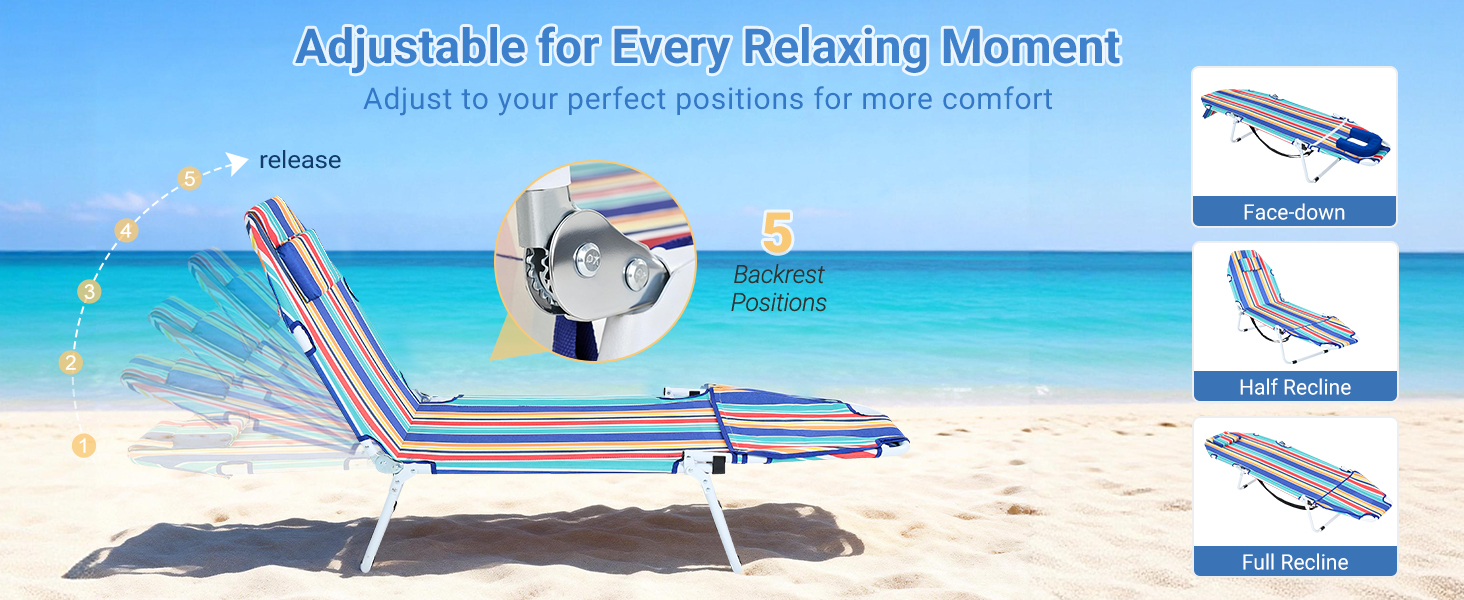 【5-POSITION ADJUSTABLE LOUNGE CHAIR】Featuring 5 adjustable reclining positions, this outdoor lounge chair lets you easily find your ideal angle. Sit upright, recline comfortably, or lie completely flat for sunbathing, tanning, reading, relaxing, or napping