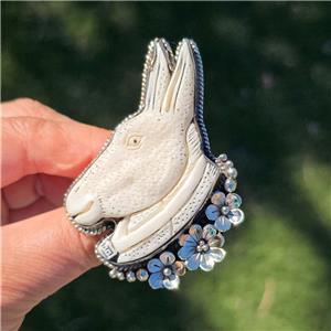Large donkey head hand carved in exquisite details! You will like the speckled fine texture and the gentle eye, and the bell around the neck! Three shiny silver tone flowers set on bottom. The back is embossed with flowers as well. Whimsical and fun conversational piece! Perfect for those who appreciate intricate artistry and playful elegance!