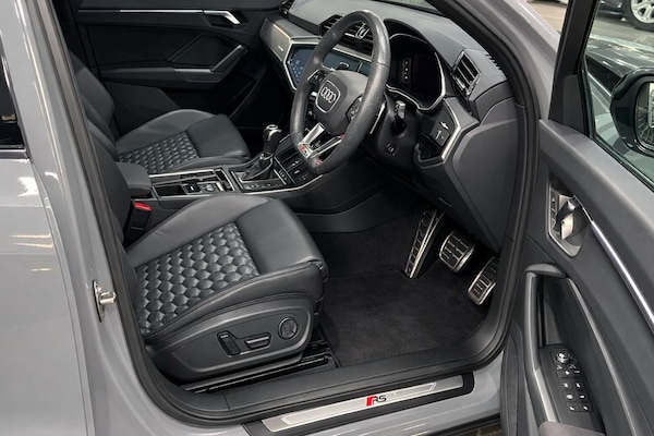 .Nardo Grey, 1 x USB-C and 1 x USB-A Port with Charge and Data Functions, 20in Alloy Wheels - 10-Spoke Star Design, 4-Way Electric Lumbar Support, 6-Airbag System, ABS - Anti-Lock Braking System, Adjustable Rear Seat Bench-Backrest with Centre Armrest and Cupholder, Advanced Key, Aluminium Look Interior Elements, Aluminium Roof Rails, Aluminium Window Trims, Ambient Lighting Pack, Anti Theft Locking Wheel Bolts, Anti-Theft Alarm, Audi Beam, Audi Connect Infotainment Services Plus including Amazon Alexa Integration (3 Year Subscription From New), Audi Connect Safety and Service - e-call, Audi Drive Select, Audi Pre-Sense Front with Pedestrian and Cyclist Recognition, Audi Side Assist, Audi Smartphone Interface Includes Wireless Apple CarPlay, Audi Sound System, Audi Virtual Cockpit - 12.3in High Resolution LCD Display, Auto Dimming and Frameless Rear View Mirror, B and C-Pillar Trim in High-Gloss Black, Bluetooth Interface, Body Coloured Rear Spoiler, Camera-Based Traffic Sign Recognition, Cloth Headlining in Black, Cross-Traffic Assist Rear, Cruise Control with Speed Limiter, DAB Digital Radio, Detail in Dashboard Around the MMI Touch Colour Display in Glass Look - Black with Surround in Aluminium Look, Door Mirrors - Electrically Folding - Adjustable and Heated with Integrated LED Side Indicators and Kerb-view Function for Passenger Side, Dual-Zone Electronic Climate Control, ESC - Electronic Stabilisation Control inc ABS - ASR and EDL, Electric Windows - Front, Electrically Adjustable Front Seats, Electromechanical Parking Brake, Electronically Operated Child Locks, Exterior Mirror Housings in Aluminium Look, First Aid Kit and Warning Triangle, Flared Wheel Arches - by 10mm, Flat Slits above Singleframe Grille, Front Centre Armrest, Front RS Sports Seats, Front Spoiler Blade - Side Blades - Inserts on Door Trim Strips and Diffuser Insert in Matt Aluminium Look, Front and Rear Floor Mats, Headlights Washers, Heated Front Seats, Hill Descent Control, Hill Hold Assist, ISOFIX Child Seat Mounting for the Front Passenger Seat with Front Passenger Airbag Deactivation and ISOFIX Child Seat Mounting and Top Tether for the Outer Rear Seats, Illuminated Door Sill Trims with RS Q3 Logo at Front, Inlays - Aluminium Race - Anthracite, Interior Elements in Black Alcantara, LED Headlights with LED Daytime Running Lights and Dynamic Rear Indicator, LED Rear Lights, Lane Departure Warning, Light and Rain Sensor, Luggage Compartment Sill Protection in Stainless Steel, MMI