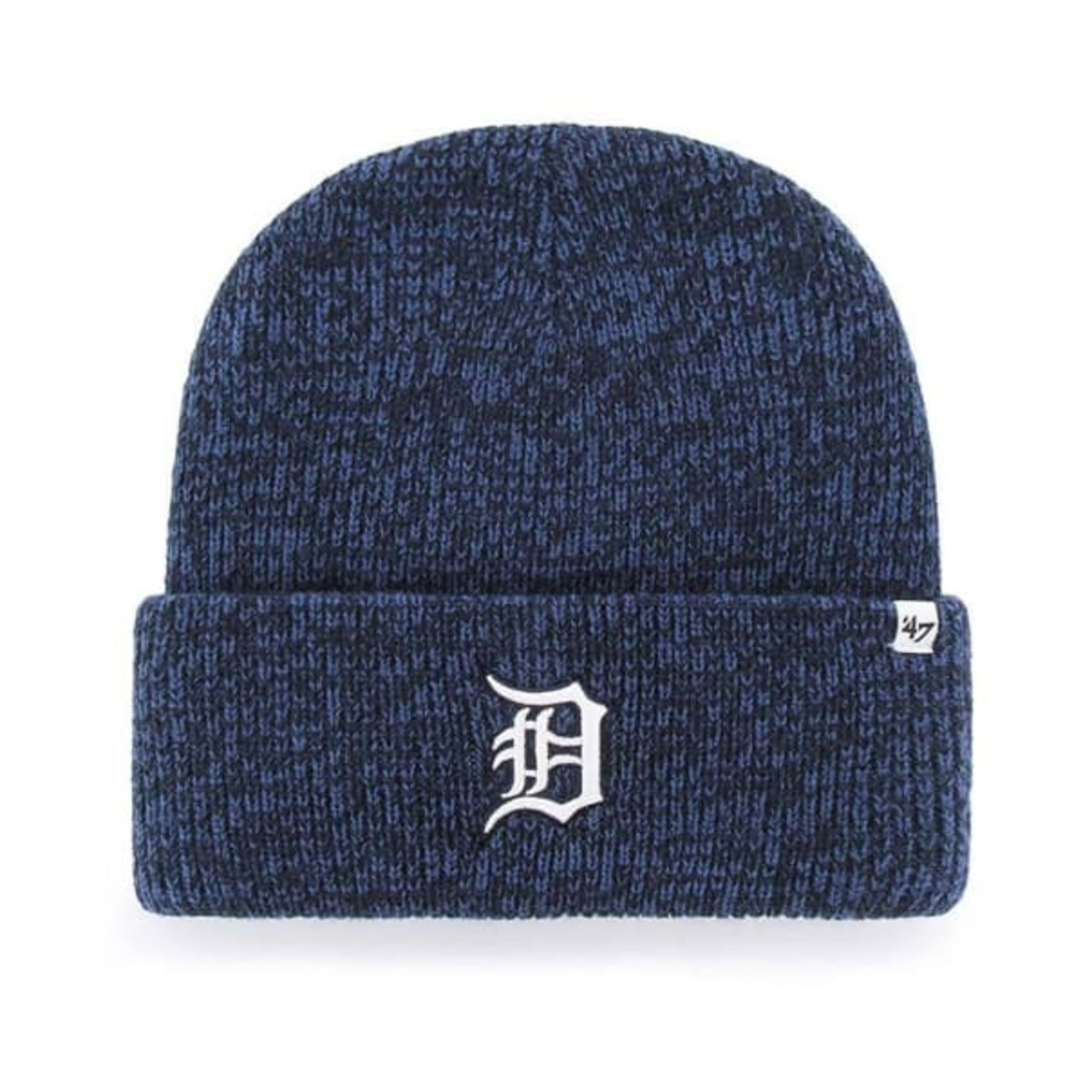Blue and navy heathered knit beanie with white embroidered Detroit Tigers D.