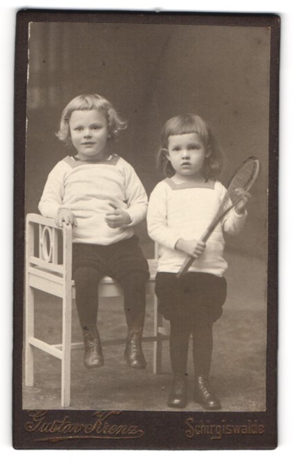 Fotografie Gustav Krenz, Schirgiswalde, Zwei modisch gekleidete Kinder mit Tennisschläger