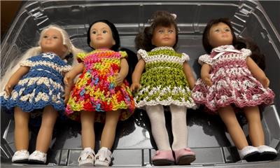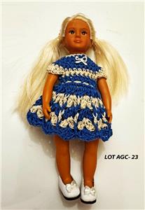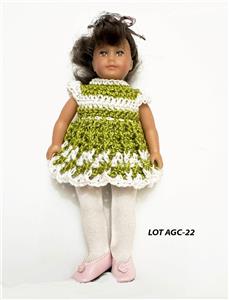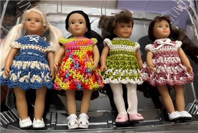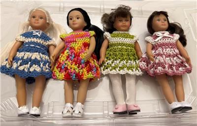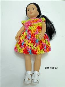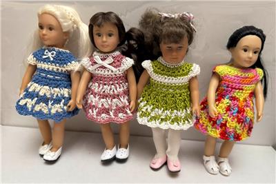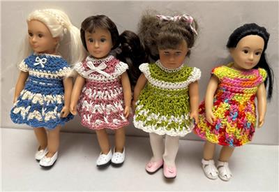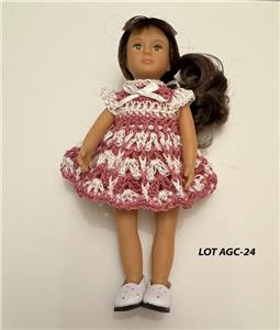 Hand crochet in the USA for the 6" Mini American Girl dolls with the older cloth body and Lori dolls. Also fit the vinyl body Mini American Girl dolls. One of a kind. Outfit is modeled by Mini American Girl doll Samantha with the cloth body and Lori dolls. Each dress will also fit the slimmer all vinyl body Mini American Girl dolls and 6" Lori dolls.