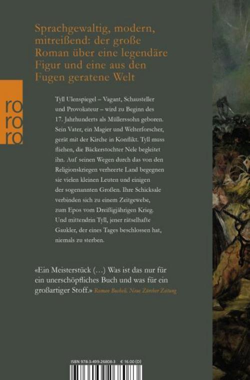 Sprachgewaltig, modern, mitreißend: Der Spiegelbestseller über eine legendäre historische Figur und eine aus den Fugen geratene Welt vom international gefeierten Daniel Kehlmann. Tyll Ulenspiegel - Vagant, Schausteller und Provokateur - wird zu Beginn des 17. Jahrhunderts als Müllerssohn geboren. Sein Vater, ein Magier und Welterforscher, gerät mit der Kirche in Konflikt. Tyll muss fliehen, die Bäckerstochter Nele begleitet ihn. Auf seinen Wegen durch das von den Religionskriegen verheerte Land begegnen sie vielen kleinen Leuten und einigen der sogenannten Großen. Ihre Schicksale verbinden sich zu einem Zeitgewebe, zum Epos vom Dreißigjährigen Krieg. Und mittendrin Tyll, jener rätselhafte Gaukler, der eines Tages beschlossen hat, niemals zu sterben.