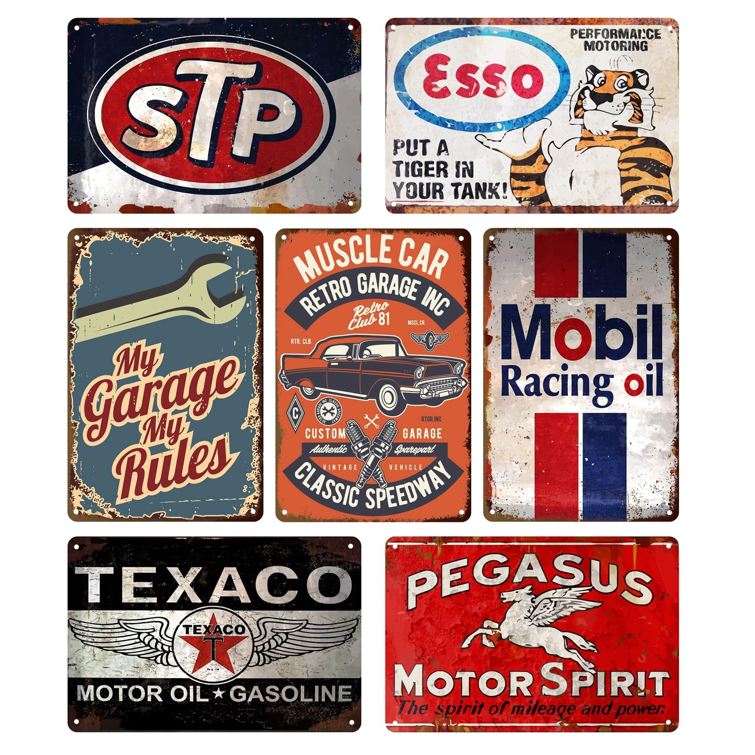 【Garage Metal Sign Package includes】7pcs 8 x 12 Inch metal tin signs feature old-fashioned graphics perfect for bringing nostalgic flair to your garage, man cave, bar or other space.