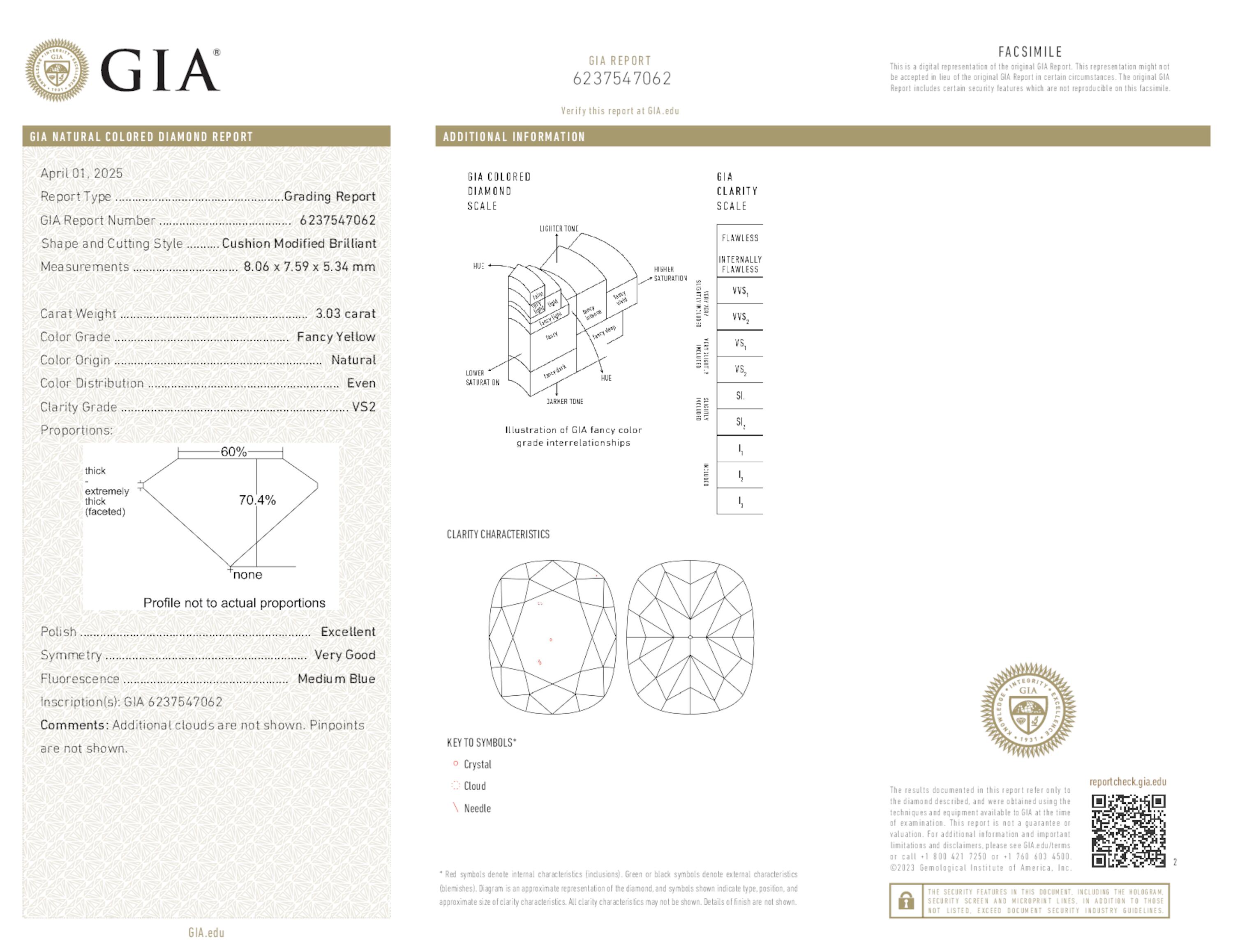 Fancy Yellow Diamond Ring, 4.40 Ct. TW, Cushion shape, GIA Certified