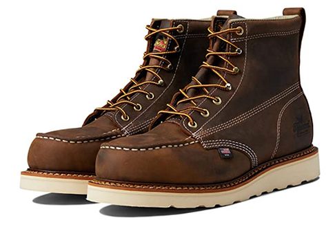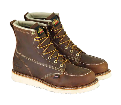 A proven design for full days of work on hard surfaces, the Thorogood American Heritage Trail Crazyhorse Moc Toe Steel Toe MAXWear Wedge Work Boots for Men combine the comfort and performance you want on the job. These boots feature rugged Trail Crazyhorse leather uppers with roomy moc toes to protect feet while allowing them to breathe at the same time. The boots' protective steel toes provide worksite protection that meets or exceeds ASTM F2413-18 I/C EH safety standards. Goodyear storm welt construction locks the American Heritage's tough uppers to the rest of the boots, giving these boots long-lasting durability and stability. Sitting on top of a lightweight, supportive, and stabilizing composite shank, these boots feature a removable Ultimate Shock Absorption footbed and Poron comfort cushion insole to absorb shock and cushion feet all-day long. Offering additional shock absorption, the oil- and slip-resistant MAXWear Wedge outsoles give guys better traction over smooth and slick work surfaces. Avg. ht.: 6". Imported.