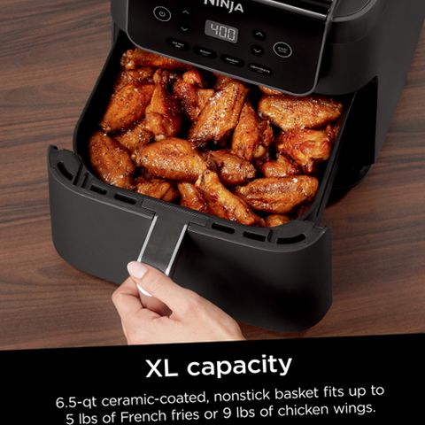 The Ninja 4-in-1 Pro XL Air Fryer AF180 combines powerful performance with versatile cooking options to elevate your kitchen experience. Utilizing Air Crisp Technology, it circulates superheated air at temperatures up to 400°F to produce hot, crispy foods with up to 75% less fat compared to traditional frying methods. The extra-large 6.5-quart nonstick basket and crisper plate accommodate up to 9 lbs of chicken wings or 5 lbs of French fries, perfect for family-sized portions. This multi-functional appliance offers four cooking modes: Air Fry for crispy snacks, Roast for tender meals, Reheat for quick warming, and Dehydrate for preserving fruits and snacks. Designed with convenience in mind, the basket and crisper plate are both nonstick and dishwasher safe, ensuring effortless cleanup after use. Its space-saving design fits comfortably on countertops without sacrificing capacity. Included with the air fryer are a chef-inspired recipe book and cooking charts to inspire your culinary creativity. With features like automatic shut-off, digital display, end-of-cycle signal, and removable basket, this air fryer delivers safety and ease of use for everyday cooking.