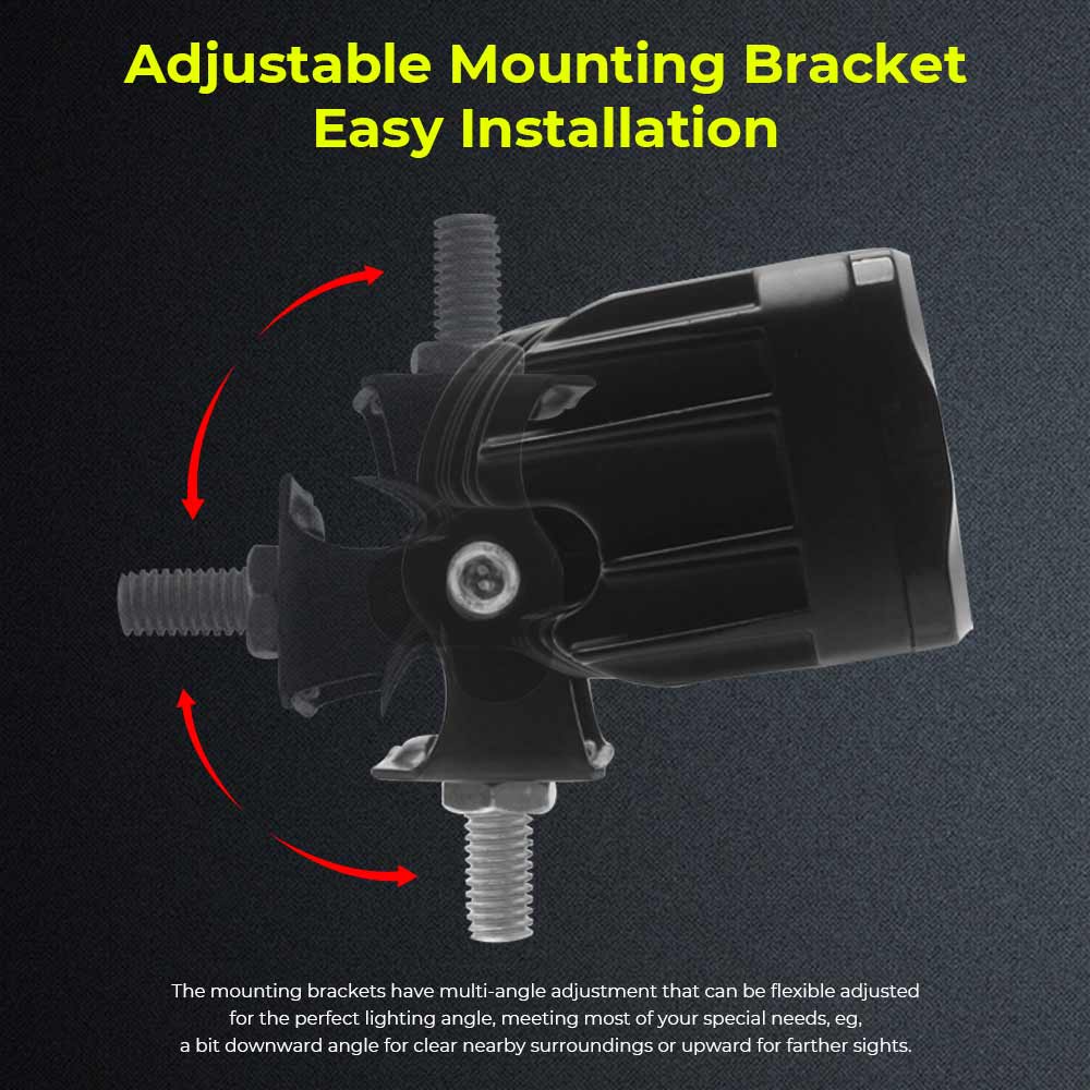 The mounting brackets have multi-angle adjustment that can be flexible adjusted for the perfect lighting angle, meeting most of your special needs, eg, a bit downward angle for clear nearby surroundings or upward for farther sights.