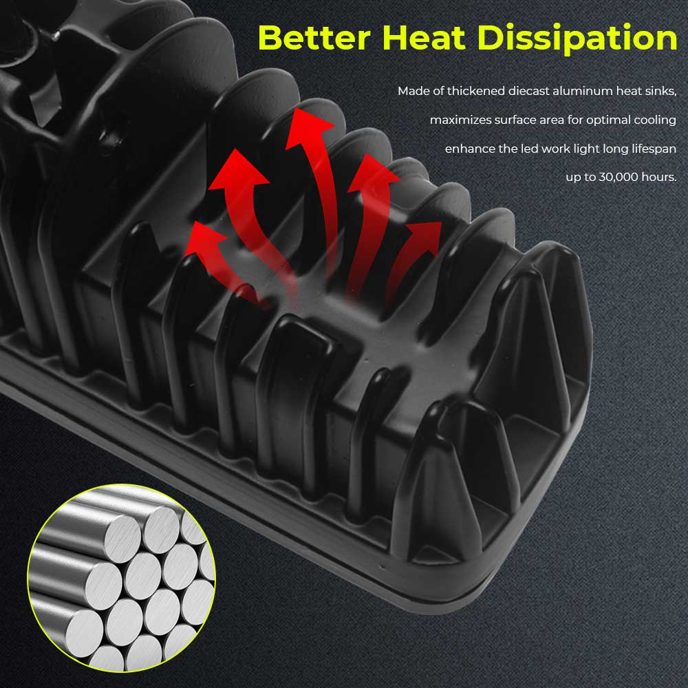 Made of thickened diecast aluminum heat sinks, maximizes surface area for optimal cooling enhance the led work light long lifespan up to 30,000 hours.