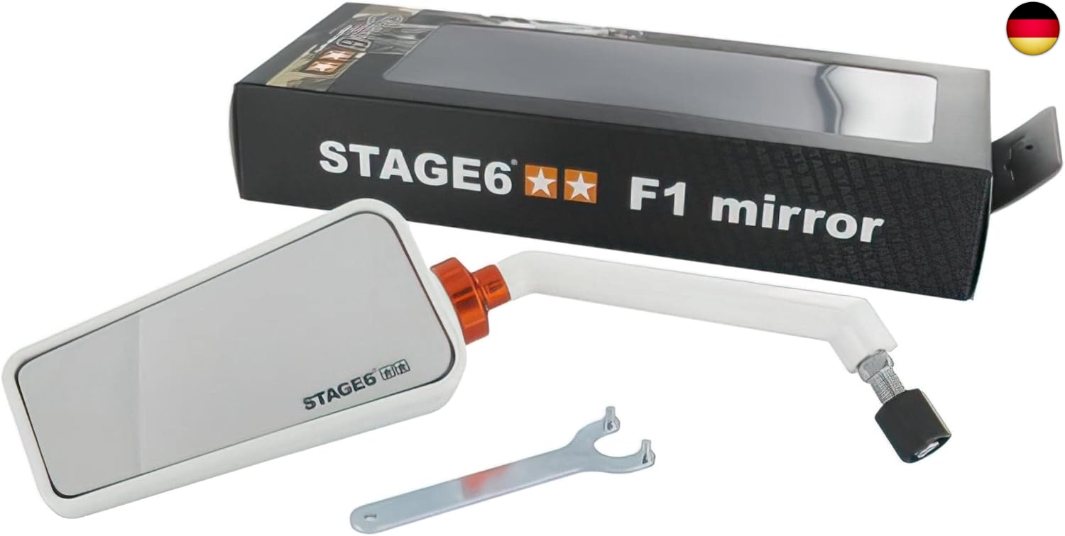 Die Styling-Abteilung von Stage6 hat sich die beliebten F1-Spiegel vorgenommen, die von vielen Herstellern seit Jahren unverändert angeboten werden, und ihnen ein ordentliches Redesign und Qualitätsupgrade verpasst. Die Einstellung erfolgt über ein großes Kugelgelenk, das sich in einem weiten Bereich justieren lässt. Die Spiegelarme aus Metall wurden recht kurz gehalten, um auch den optischen Aspekt nicht aus den Augen zu verlieren. Fixiert wird der Spiegel über die orange eloxierte Feststellmutter
