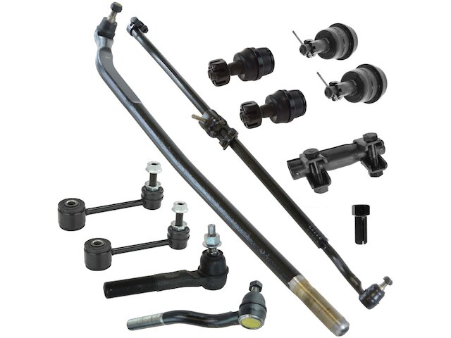 Package Contents: (2) Front Upper Ball Joints; (2) Front Sway Bar Links; (2) Front Lower Ball Joints; (1) Front Outer Tie Rod; (1) Front Lower Outer Drag Link; (1) Front Tie Rod Adjusting Sleeve; (1) Front Upper Outer Drag Link; (1) Front Tie Rod Adjusting Sleeve at Pitman Arm; (1) Front Inner Tie Rod at Pitman Arm