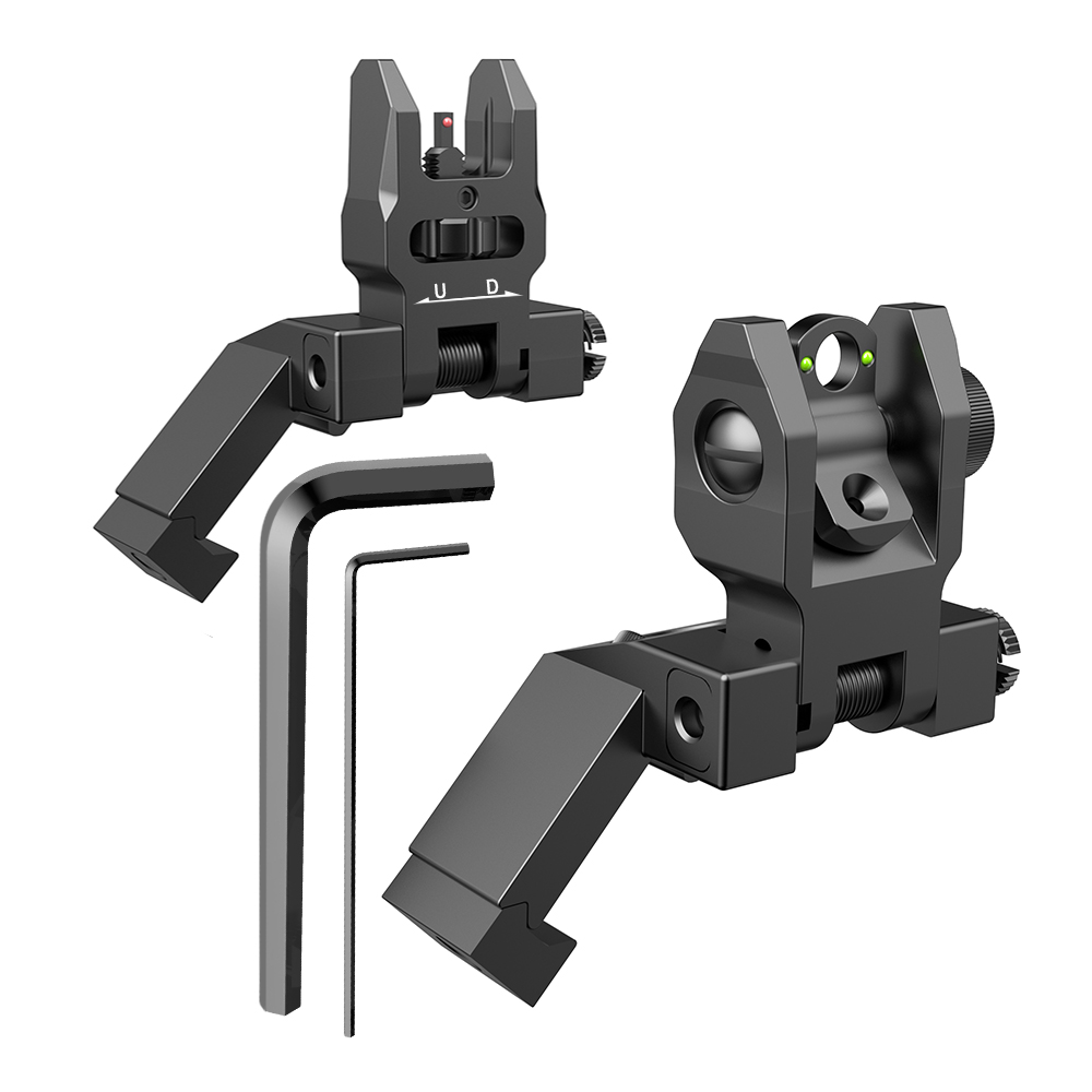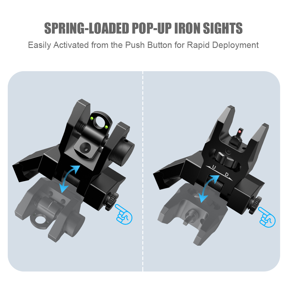 45 Degree Offset Design: 45 Degree angled offset allows quick access. The flip-up design enables easy raising or lowering of the iron sight with just a button press.