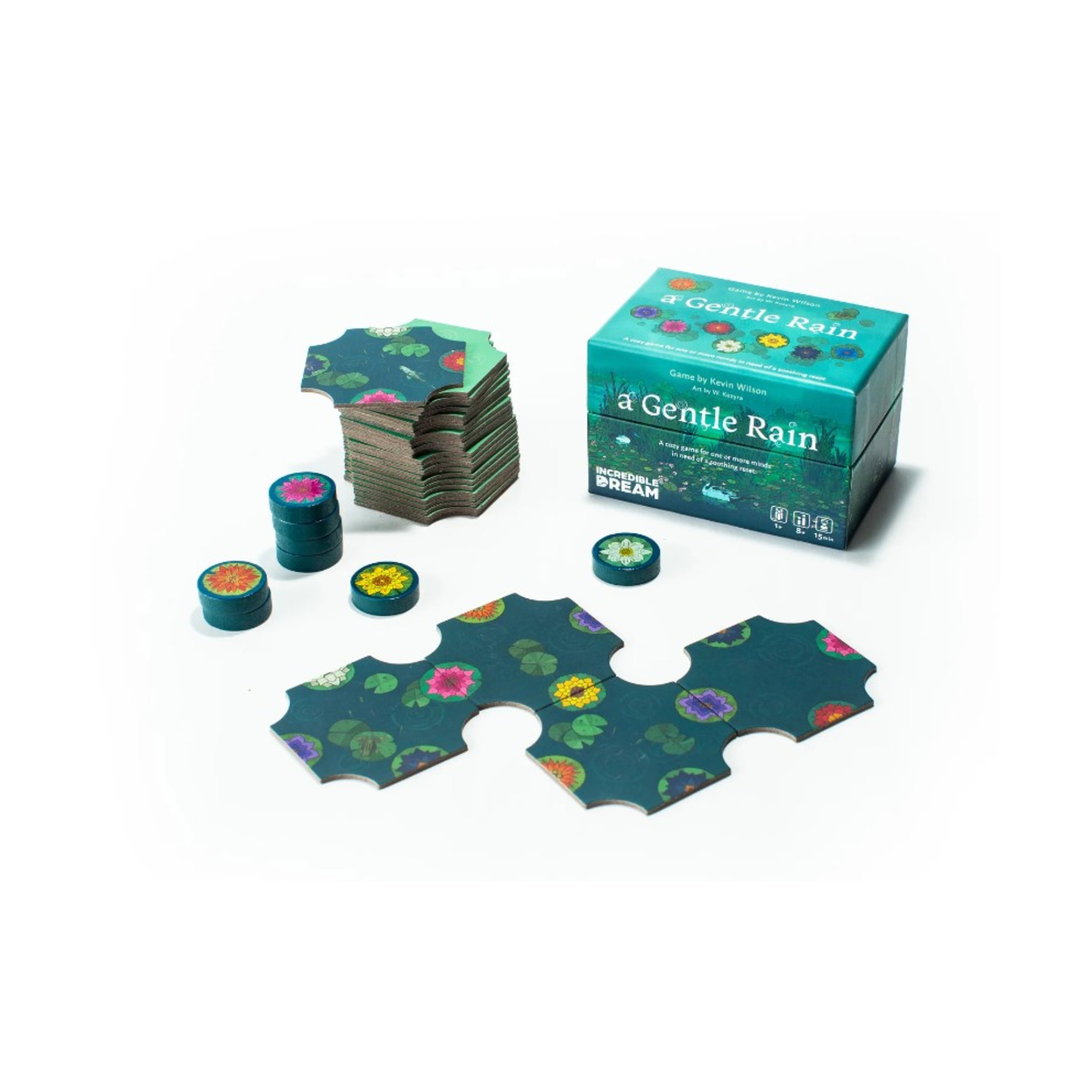 Step into "A Gentle Rain", a tranquil retreat to a quiet lake that will center your mind. Journey alone or with a fellow wanderer, thoughtfully placing each exquisite tile down... coaxing the eight blossoms to bloom, one by one.
