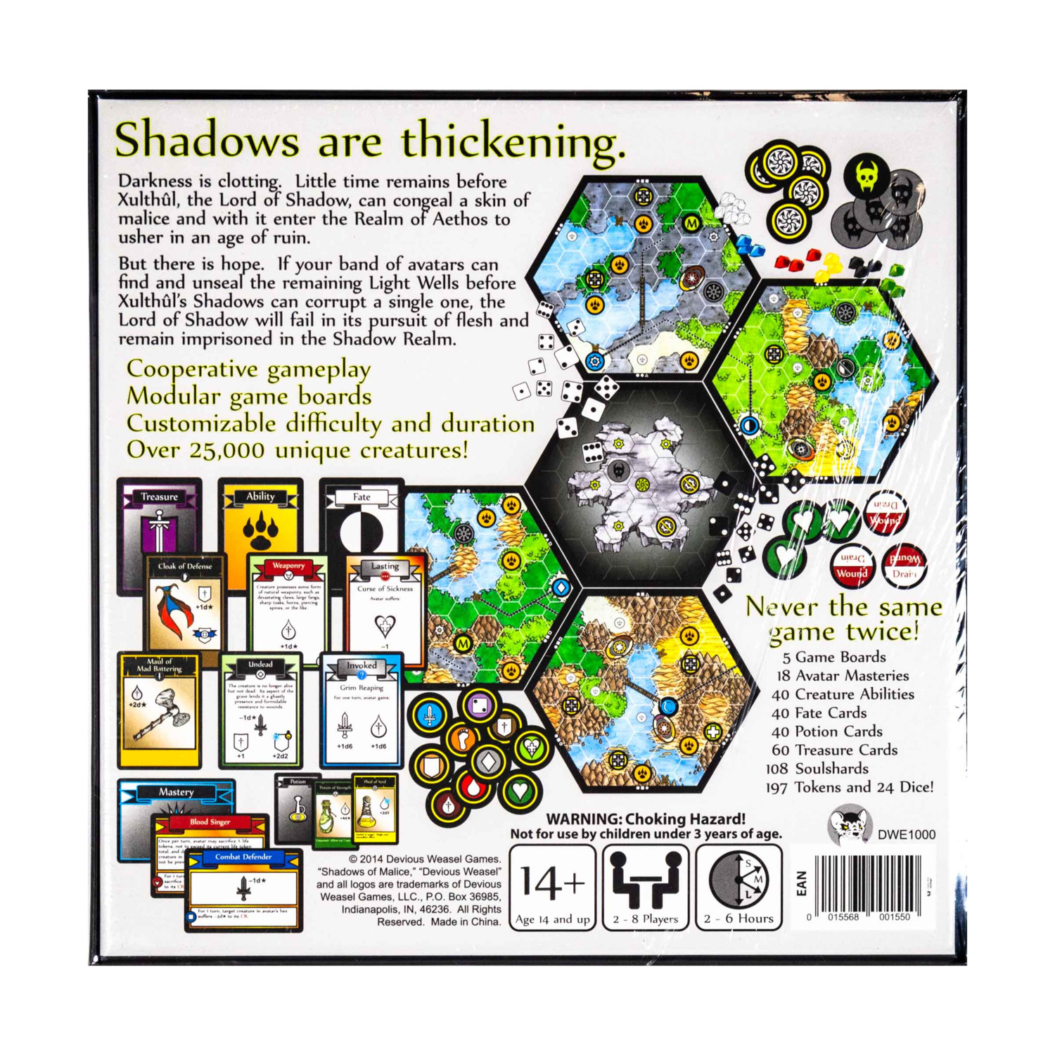 Shadows of Malice is a cooperative game in which 2-8 players work to unseal hidden Wells of Light to prevent the shadow demon Xulthûl from gaining a physical form and overrunning the Realm of Aethos.