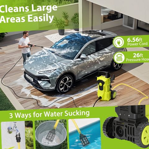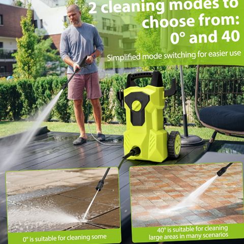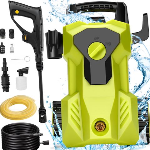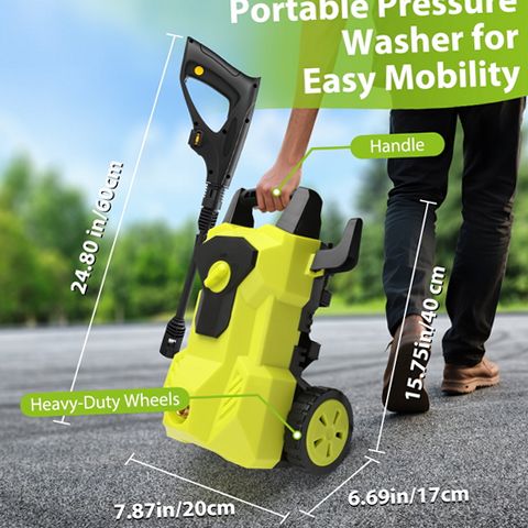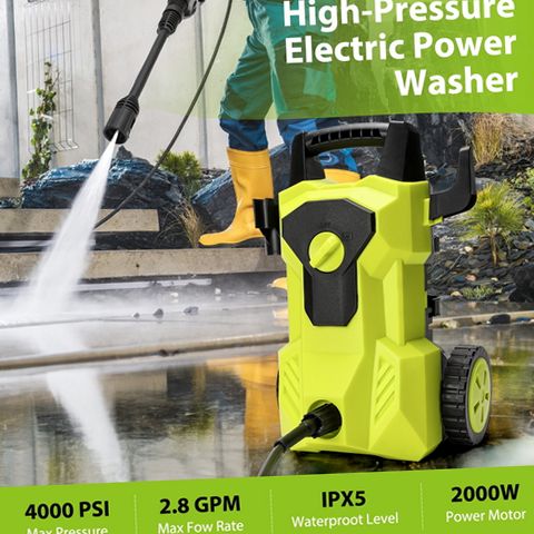 The UNTIMATY electric pressure washer offers a high-performance cleaning solution with a maximum pressure of 4000 PSI and a water flow rate of 2.8 gallons per minute powered by a 2000W motor. This versatile machine is ideal for tackling various outdoor cleaning tasks such as washing decks, patios, driveways, vehicles, and outdoor equipment. Its lightweight and compact design includes a detachable extension handle that adjusts to user height for comfortable operation and large wheels for effortless transport across different terrains. The unit comes equipped with a foam cannon to apply soap efficiently and multiple quick-connect nozzles and pipe connectors to cover light to heavy-duty cleaning needs. The Total Stop System automatically shuts off the pump when the trigger is released to save energy and prolong pump life. Additionally, the pressure washer features waterproof construction rated to IPX5 standards to protect the motor from water damage during use. With a 6.56-foot power cord and a 26-foot pressure hose, this washer provides extended reach for convenient cleaning around your home and outdoor spaces. Storage hooks keep accessories organized and accessible, making this pressure washer a dependable tool for maintaining cleanliness with ease.