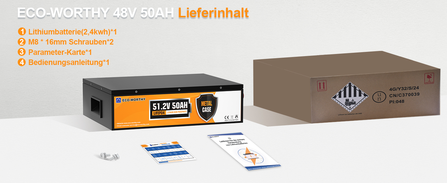 ECO-WORTHY 48V 50Ah LiFePO4-Akku ist in ein robustes Metallgehäuse für höhere Sicherheit und Hitzebeständigkeit mit M8-Schrauben eingebaut und kann auch 2P unterstützen, um eine größere Kapazität einfach zu realisieren.