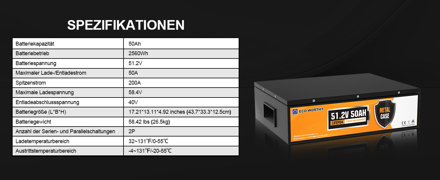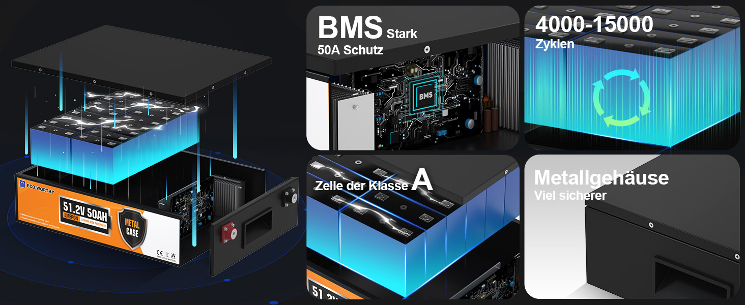 ECO-WORTHY 48V 50AH Batterie unterstützt 50A maximalen Dauerlade-/Entladestrom, die Batterie ist mit einem leistungsstarken Batteriemanagementsystem (BMS) ausgestattet, das die Batterie vor Schäden schützen kann, die durch Überladung, Überentladung, Übertemperatur, Überlastung und Kurzschluss, Batterie der Klasse A und überlegene Leistung bei niedrigen Temperaturen verursacht werden können.