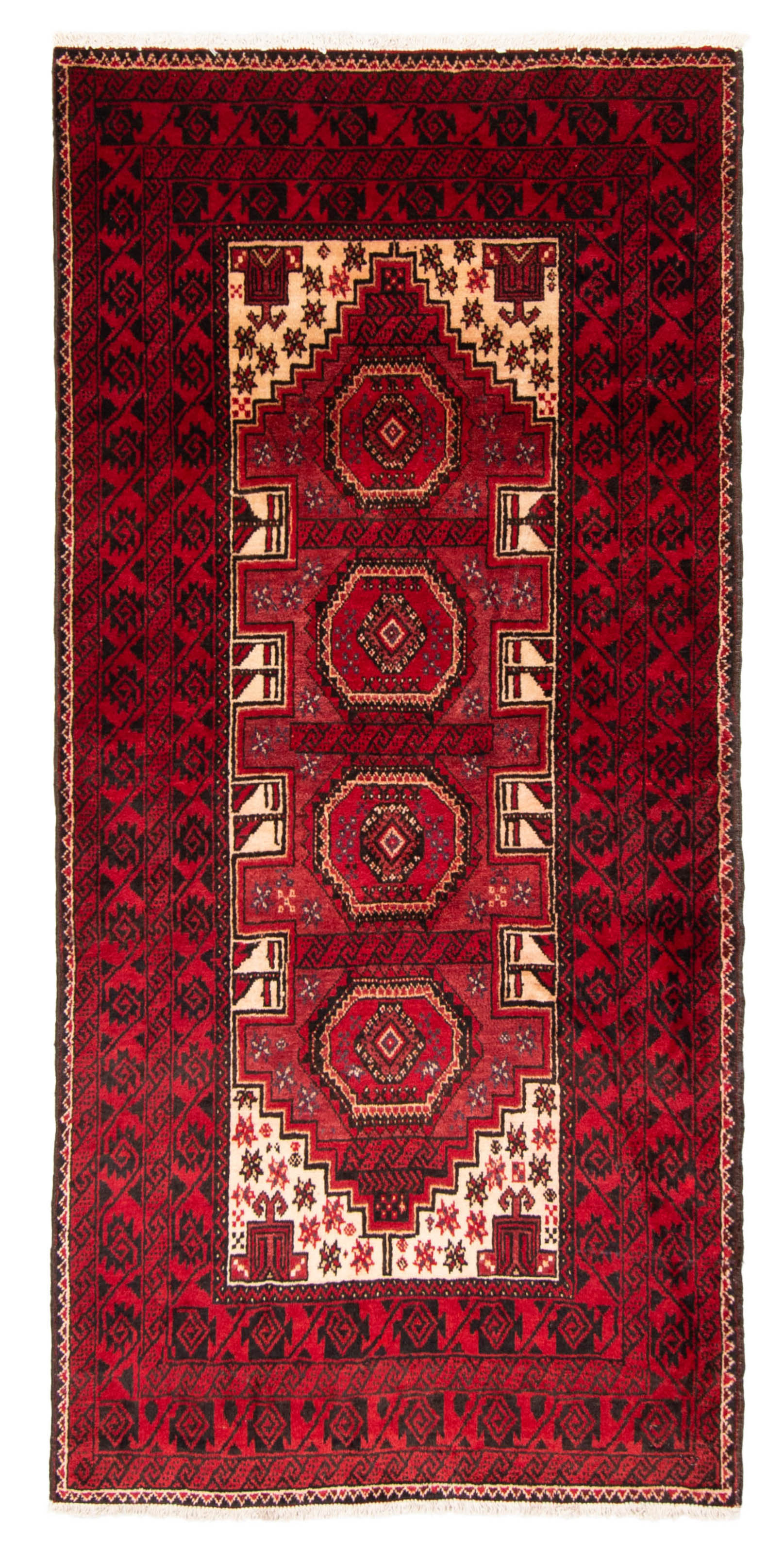 Handwoven by the Baluch tribes of Western Afghanistan and Eastern Persian Bordered, Geometric, Traditional style rug with Black, Cream, Dark Grey, Red accent colors Imported from Afghanistan and crafted using the finest weaving techniques Hand-knotted and constructed from 100% Wool with 100% Cotton foundation 3-Feet 3-Inch by 6-Feet 7-Inch (100cm x 201cm)