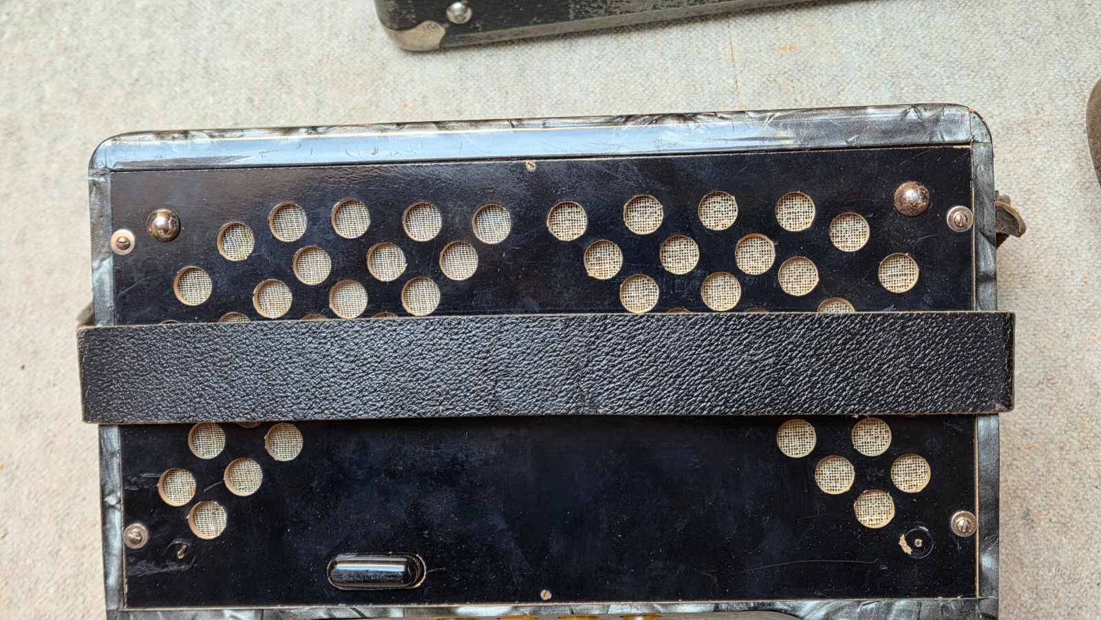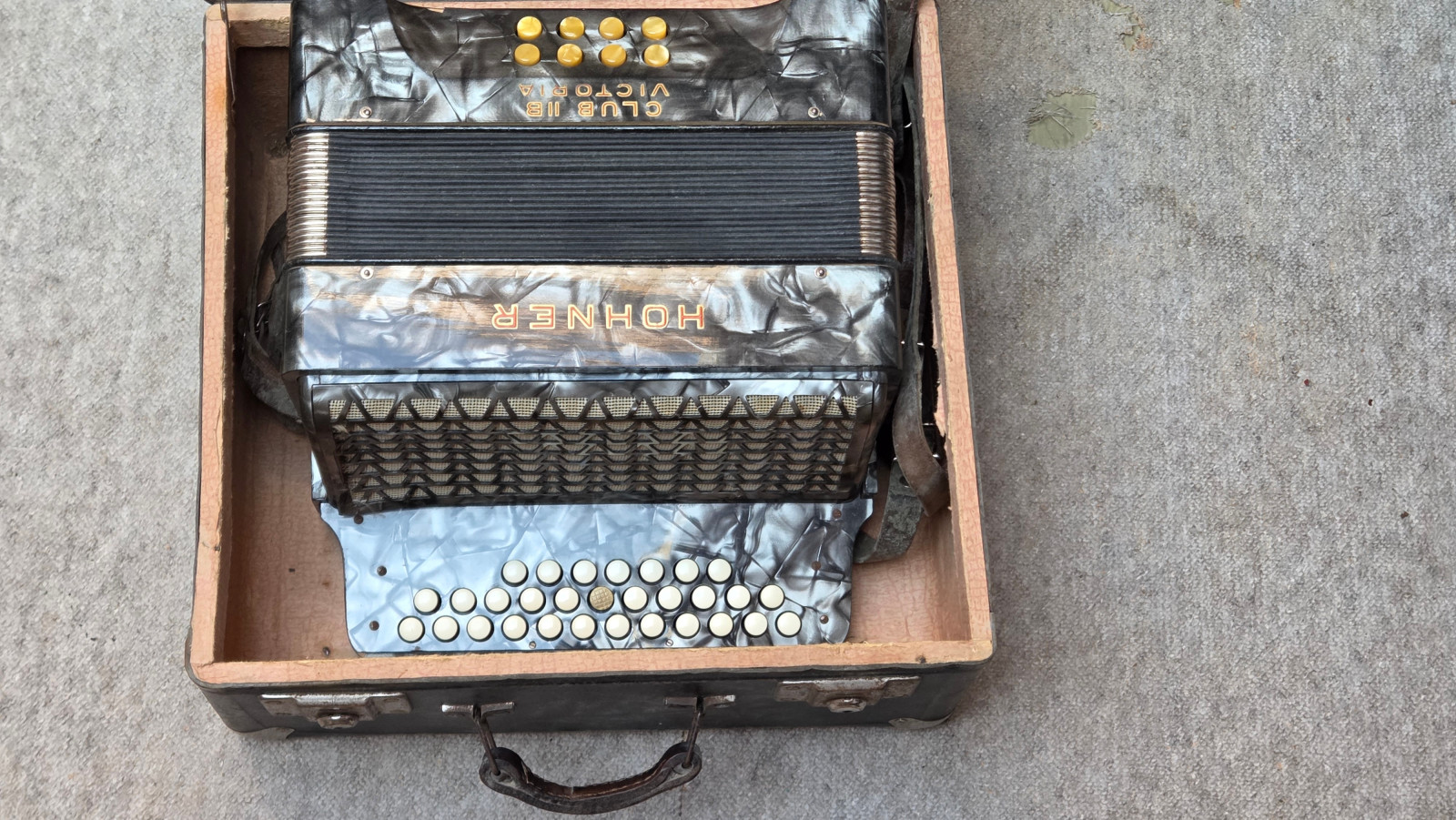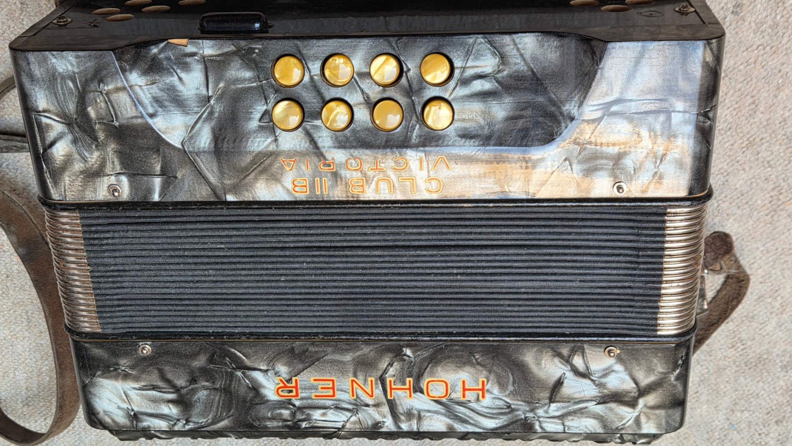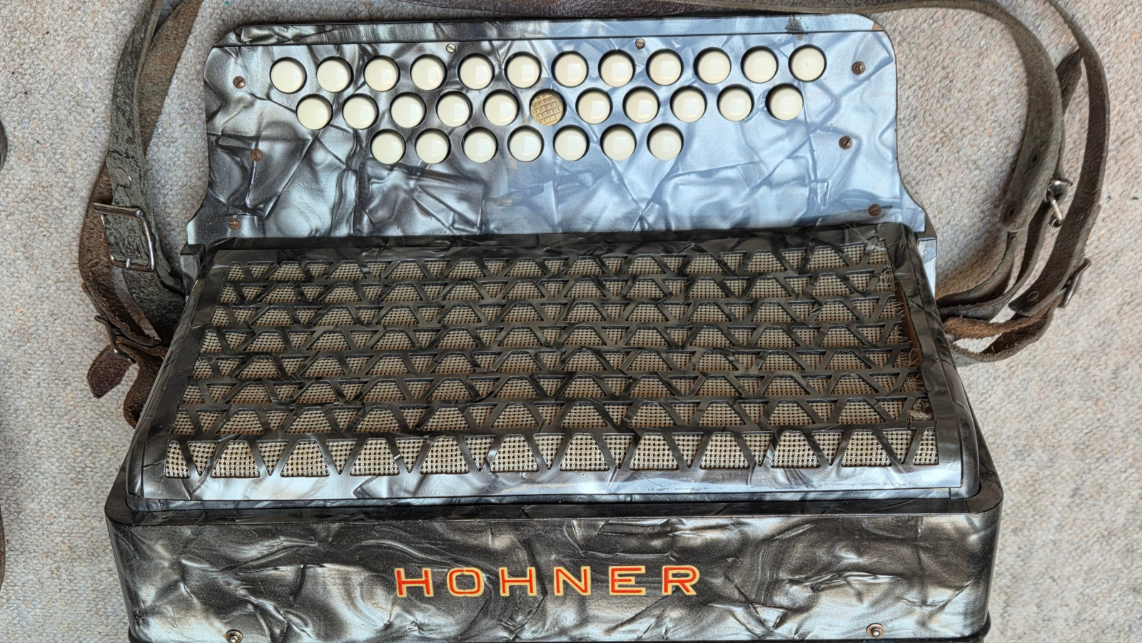 Used Hohner Diadonic button accordion. It is in C/F. The instrument measures 13" wide x 12 " long x 7' height. (33/30,5/18cm) . The instrument reads "hohner Club II B Viktoria" It is in used condition . The belly showes some wear and looses some air. The Instrument needs some service, tuning and cleaning. Please make sure that you see all the photos!