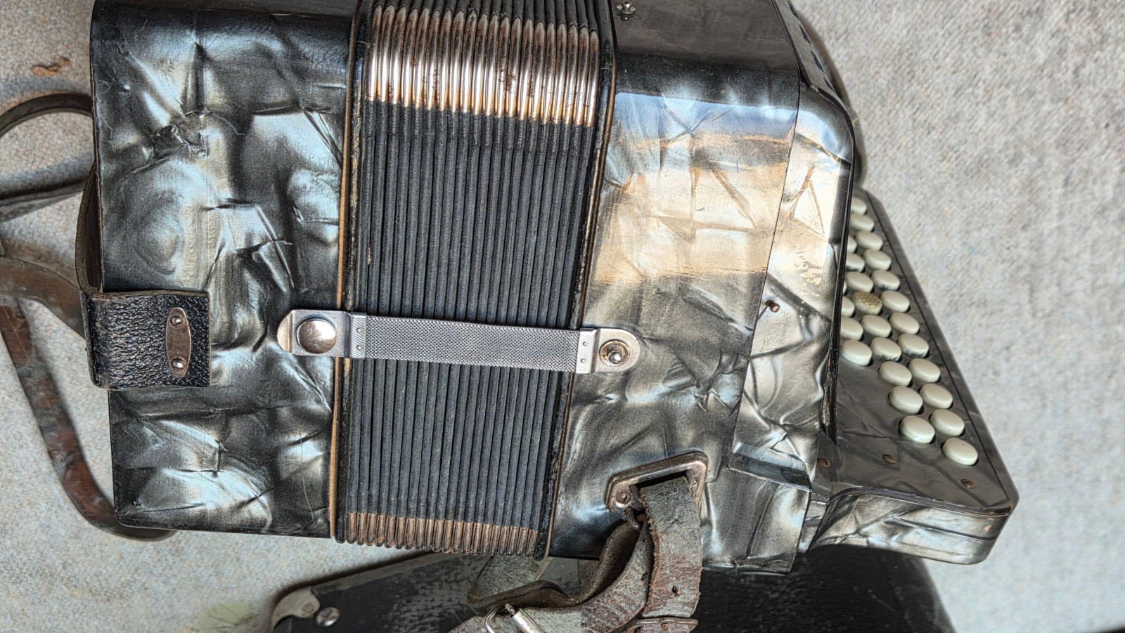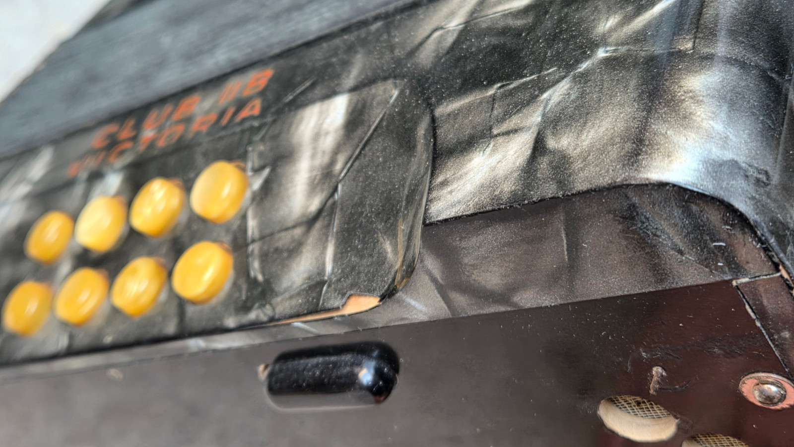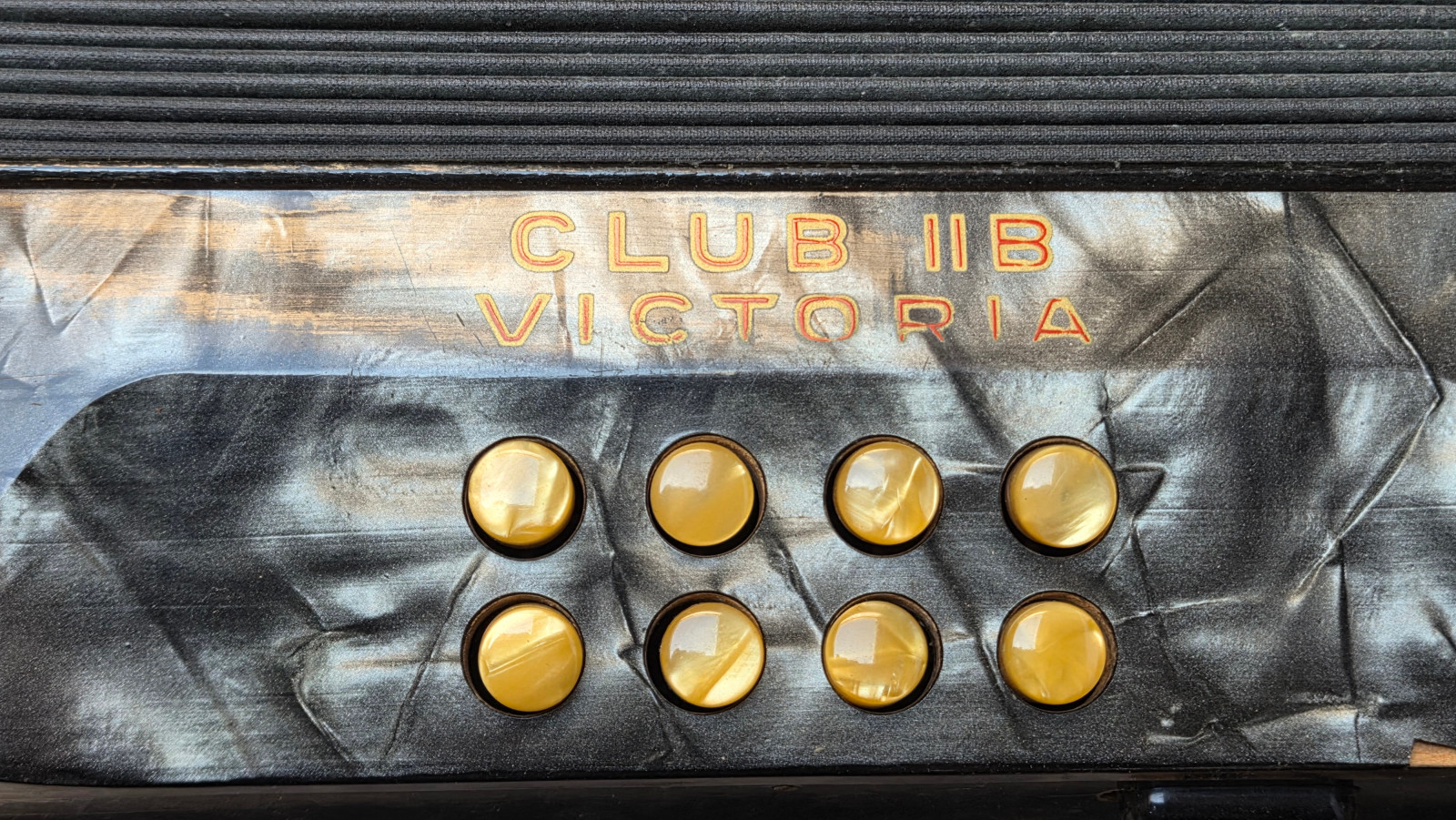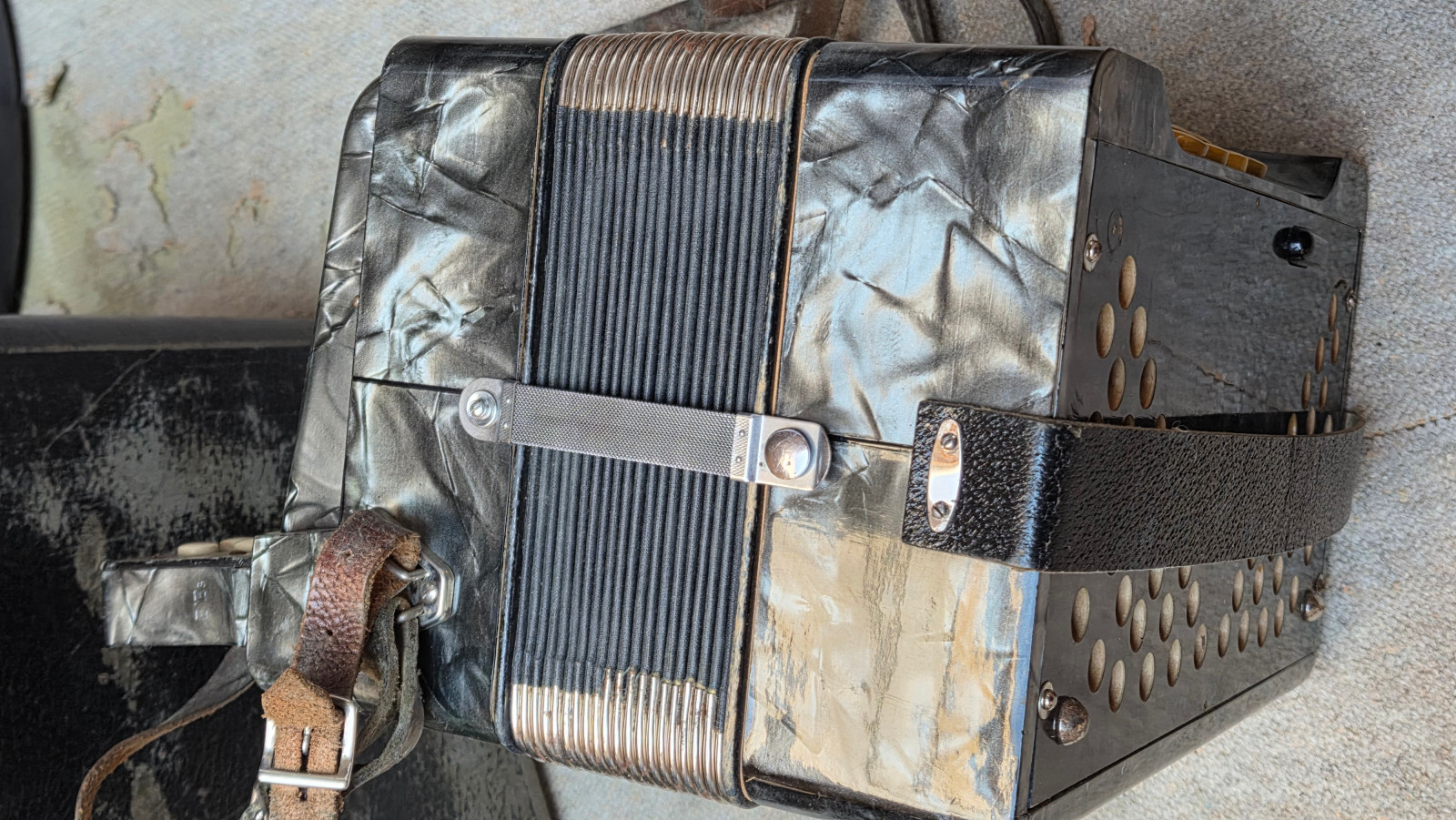 Used Hohner Diadonic button accordion. It is in C/F. The instrument measures 13" wide x 12 " long x 7' height. (33/30,5/18cm) . The instrument reads "hohner Club II B Viktoria" It is in used condition . The belly showes some wear and looses some air. The Instrument needs some service, tuning and cleaning. Please make sure that you see all the photos!