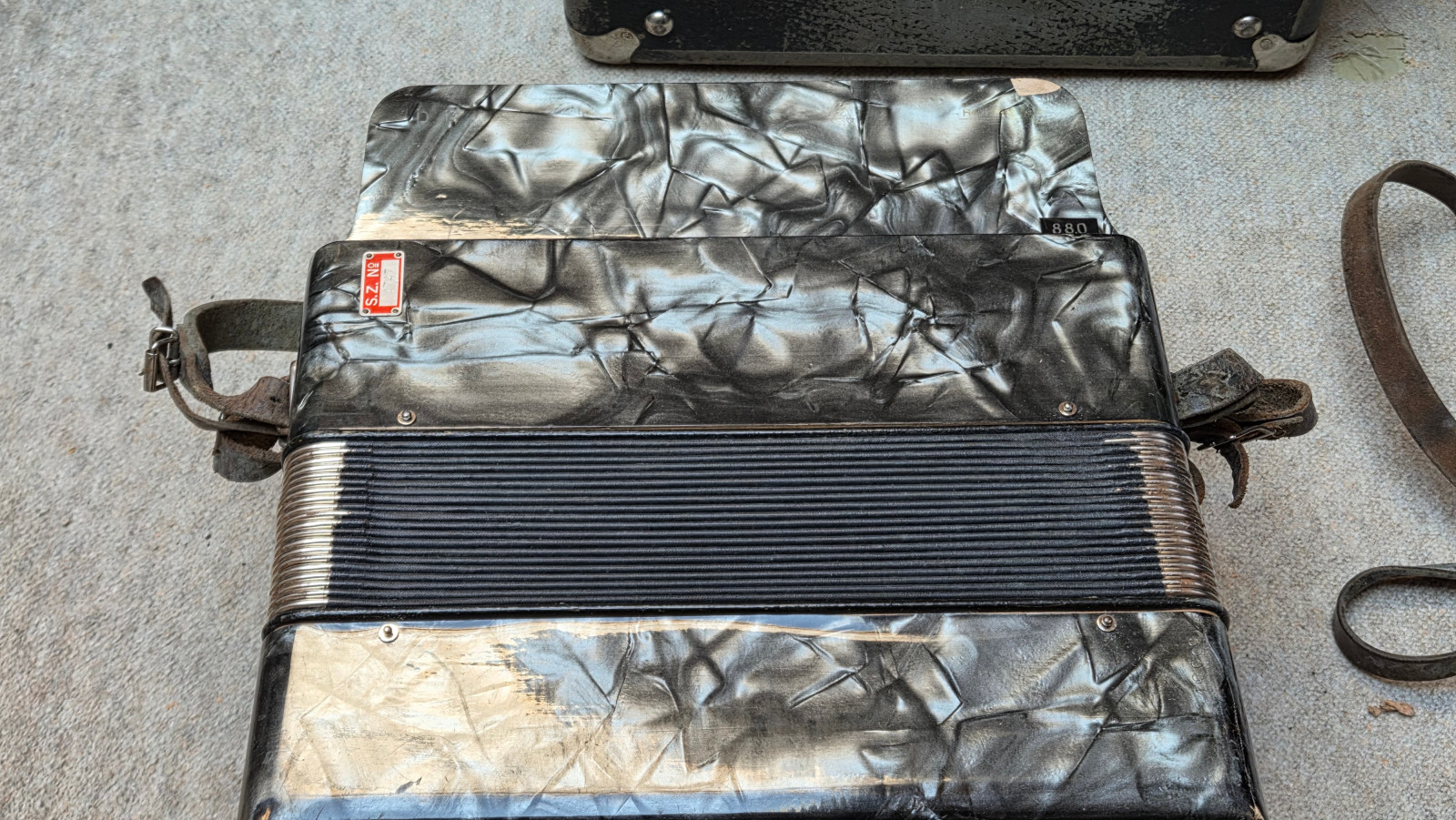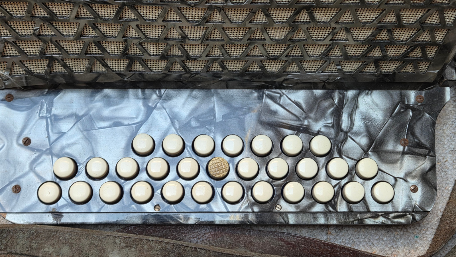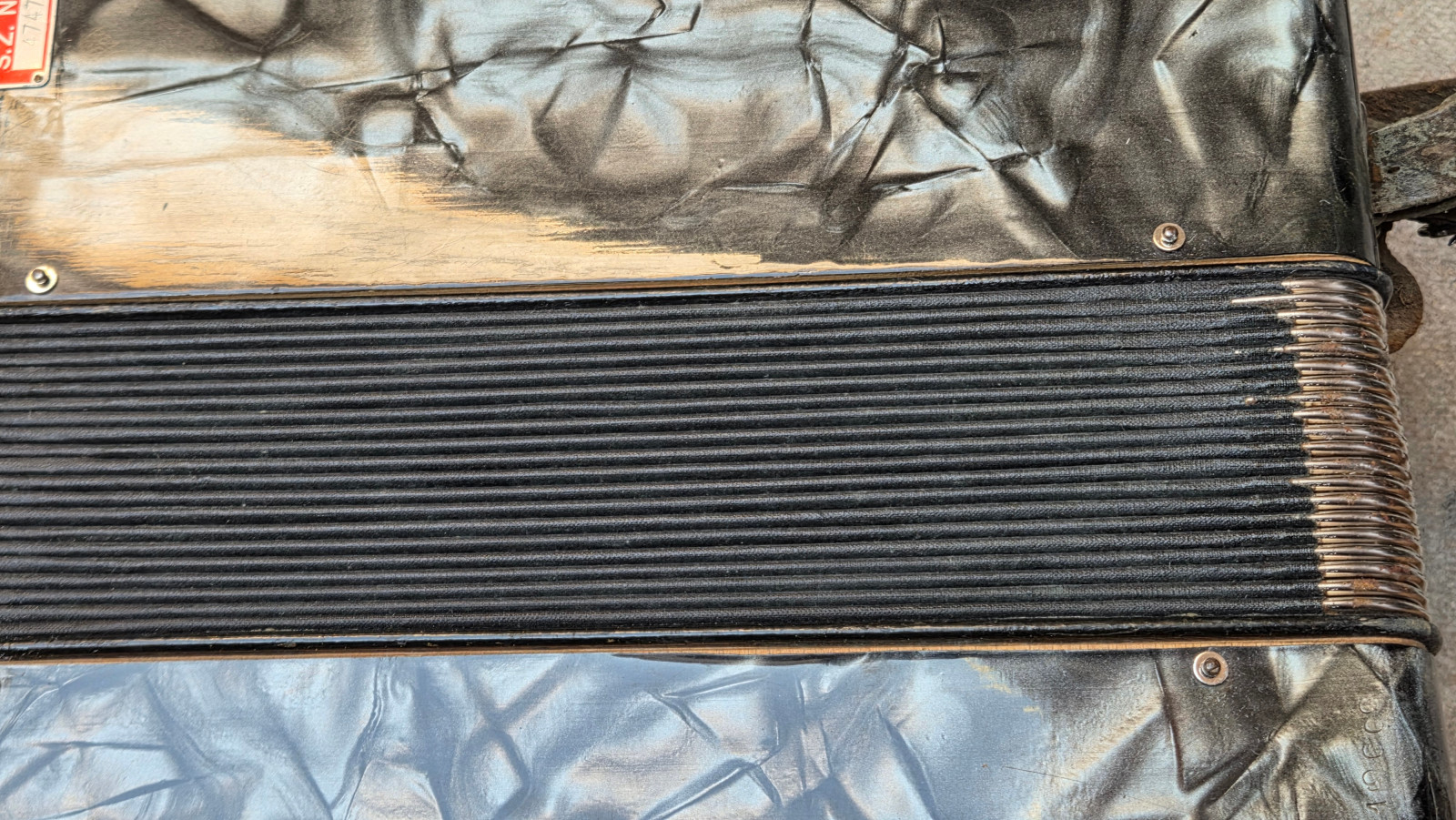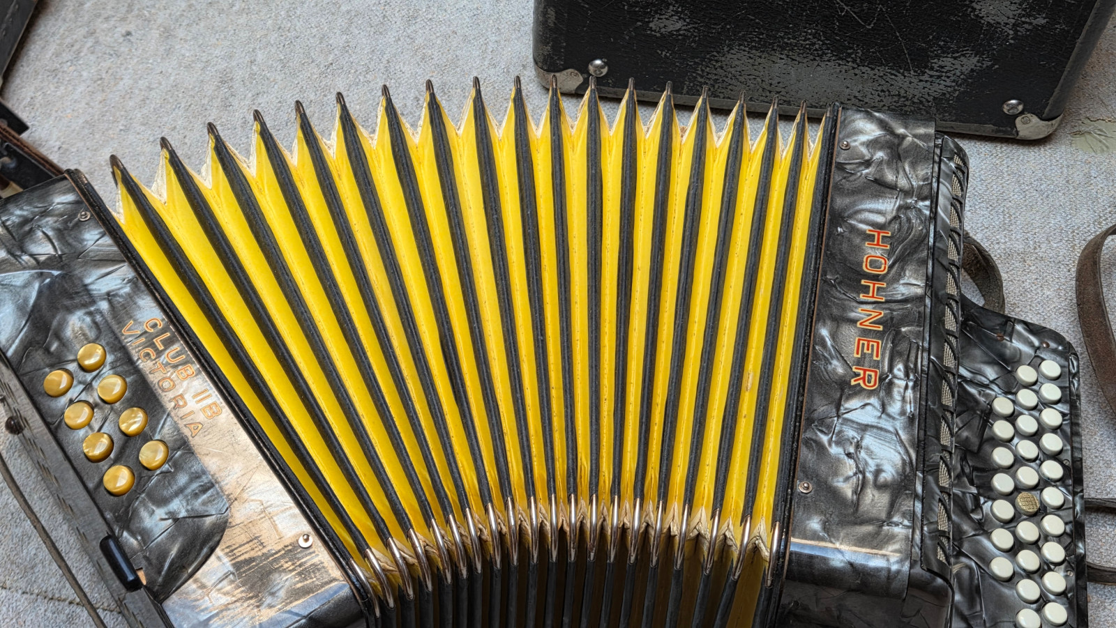 Used Hohner Diadonic button accordion. It is in C/F. The instrument measures 13" wide x 12 " long x 7' height. (33/30,5/18cm) . The instrument reads "hohner Club II B Viktoria" It is in used condition . The belly showes some wear and looses some air. The Instrument needs some service, tuning and cleaning. Please make sure that you see all the photos!