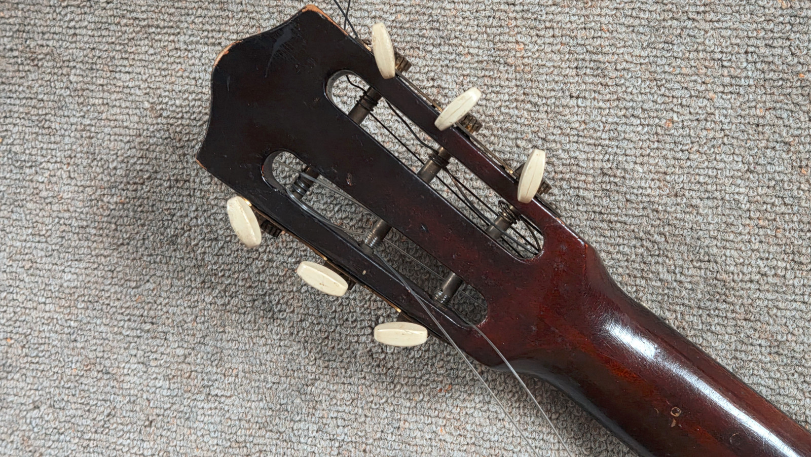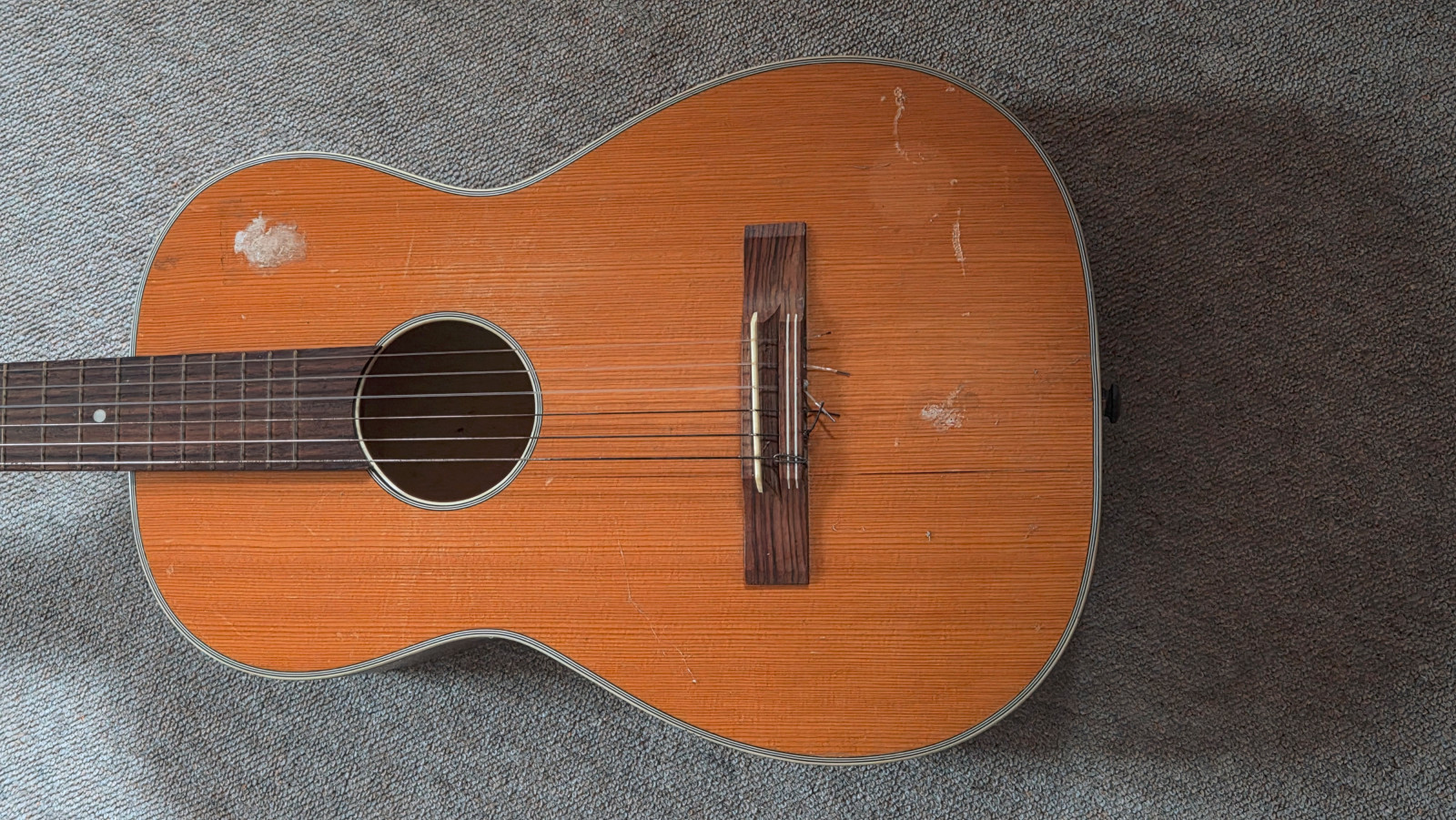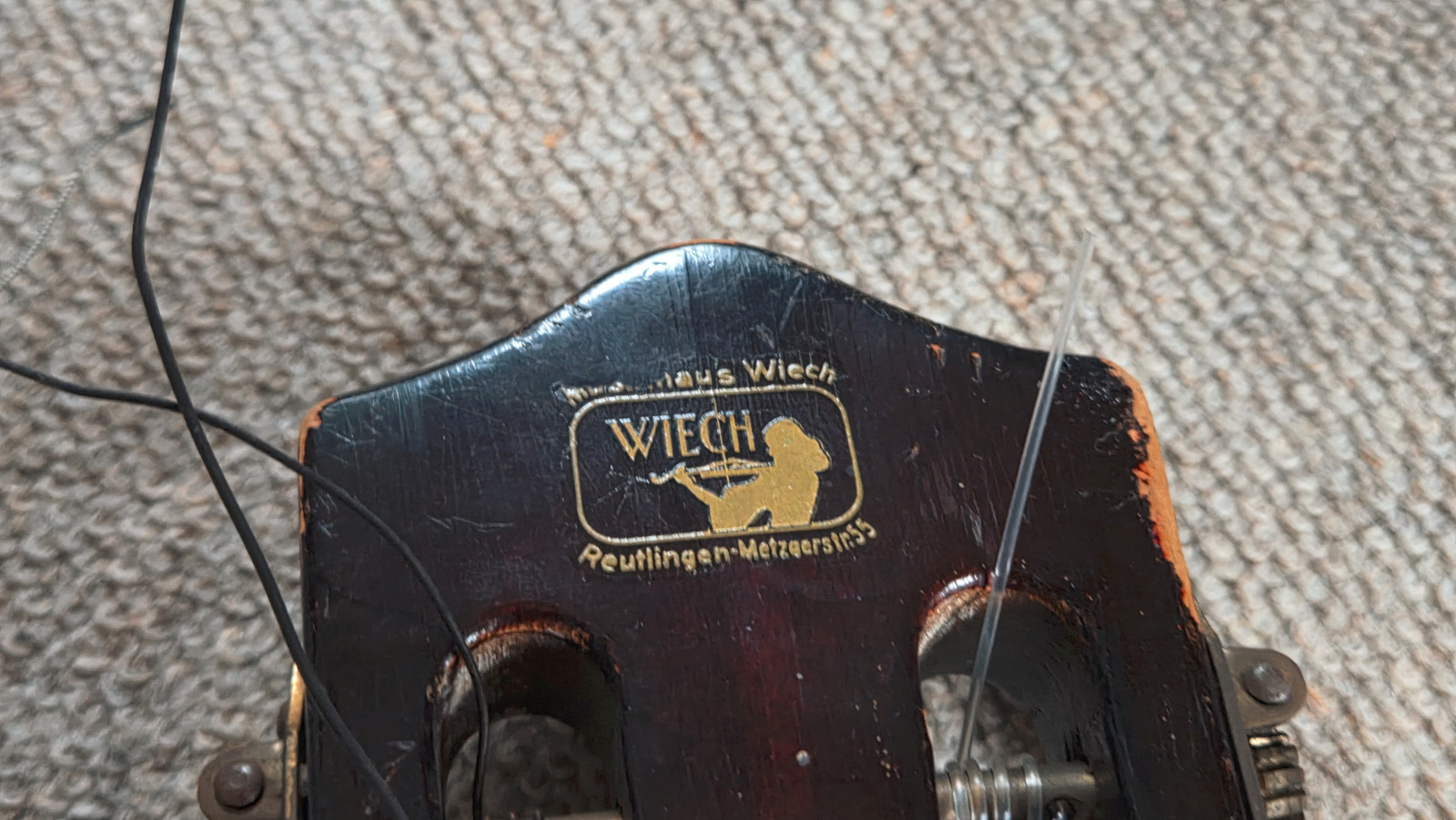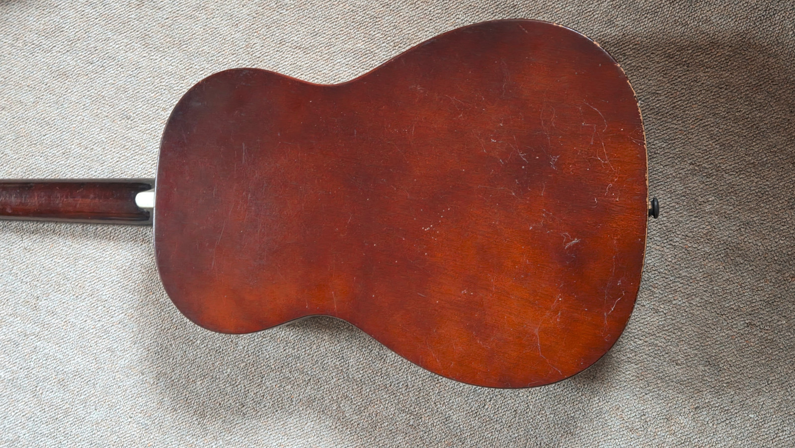 Interesting, old guitar in need of repair! No label to be found, but there is a number inside: "4461" (maybe it was made April 1961?) It once was sold by "Musikhaus Wiech, Reutlingen" (south of Germany, close to Stuttgart) The neck is staight. There is a crack at the front , and the furnish showes scretches. (see photos) The overall length is approx. 97,5cm/ 38 3/8nches, the body has 48cm/ 18 7/8 inches. it is 33,5 cm wide at the lower bout. The nut has 4,5 cm. The guitar needs repair, service and cleaning. Shipping to USA or Canada is 65$, international bidders welcome, I ship worldwide! Please also view my other auctions with instruments. Shipping more than 1 instrument would save in shipping.