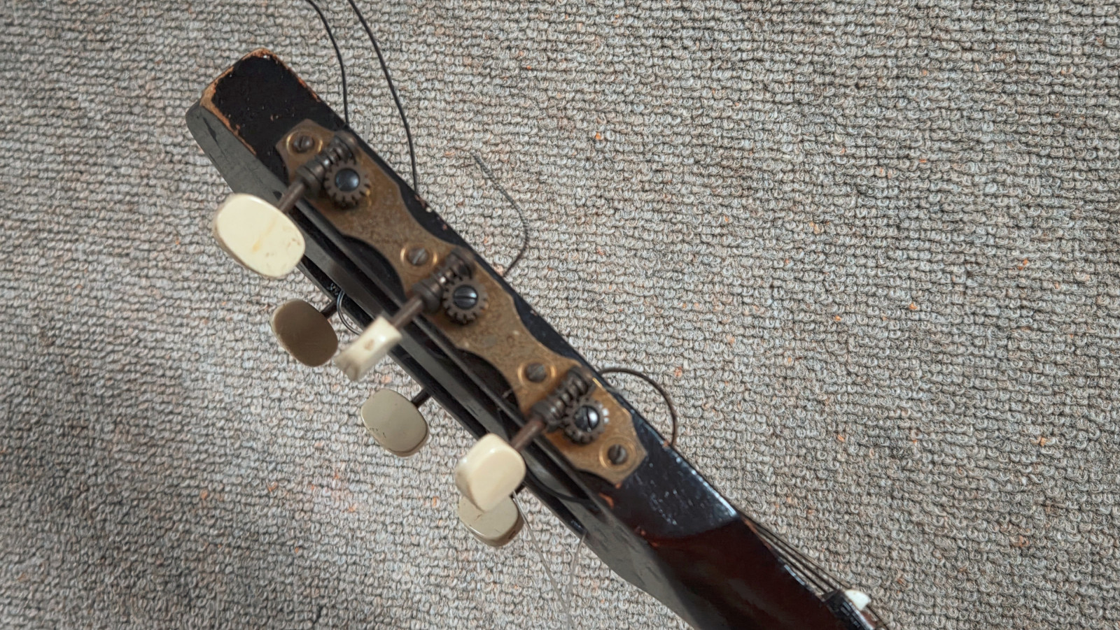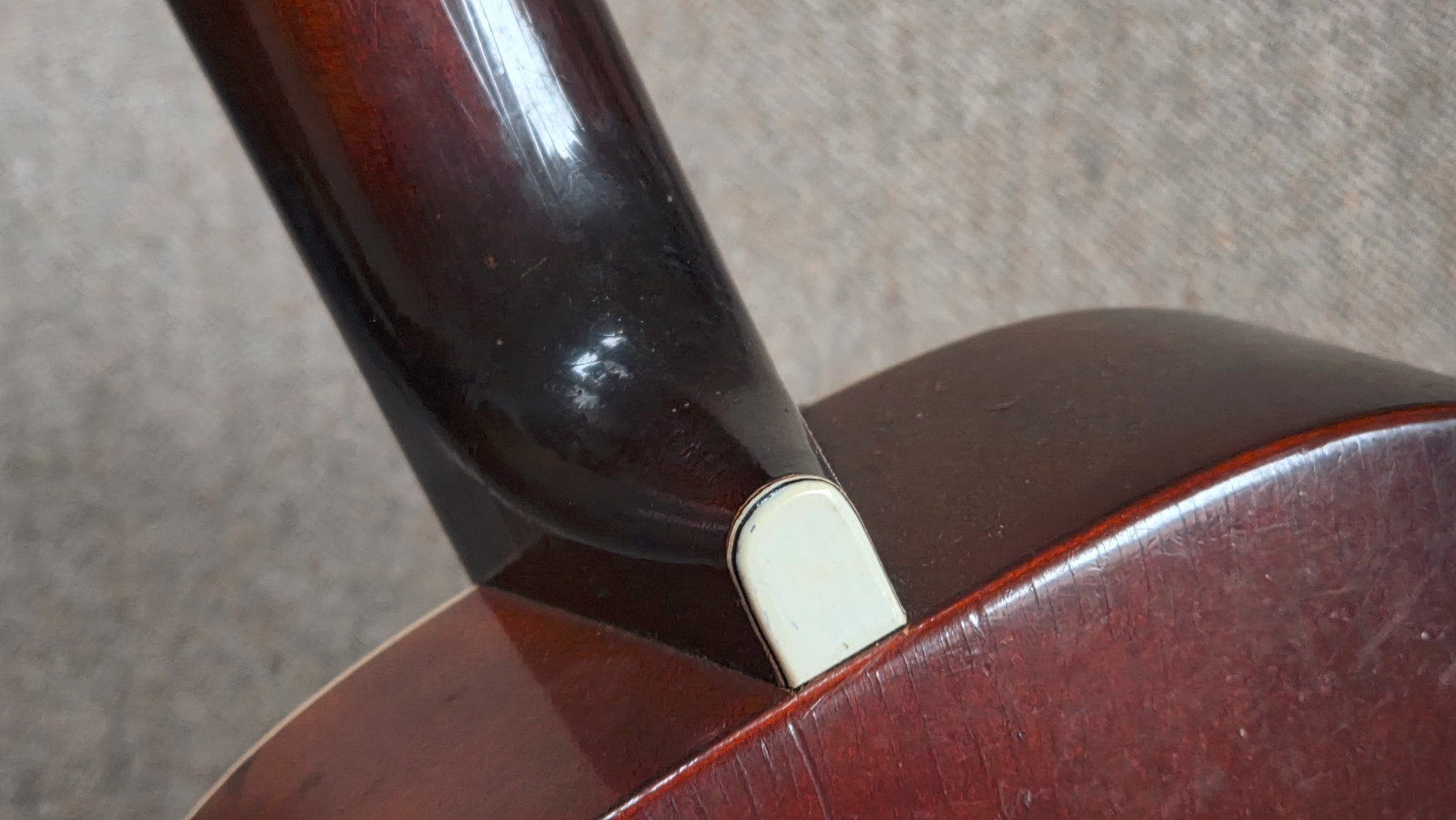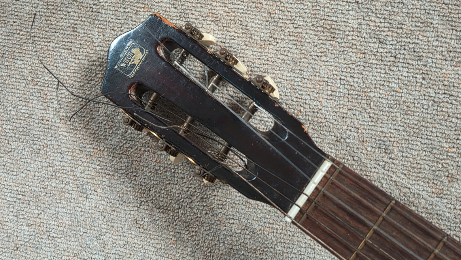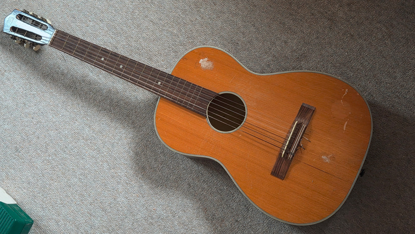Interesting, old guitar in need of repair! No label to be found, but there is a number inside: "4461" (maybe it was made April 1961?) It once was sold by "Musikhaus Wiech, Reutlingen" (south of Germany, close to Stuttgart) The neck is staight. There is a crack at the front , and the furnish showes scretches. (see photos) The overall length is approx. 97,5cm/ 38 3/8nches, the body has 48cm/ 18 7/8 inches. it is 33,5 cm wide at the lower bout. The nut has 4,5 cm. The guitar needs repair, service and cleaning. Shipping to USA or Canada is 65$, international bidders welcome, I ship worldwide! Please also view my other auctions with instruments. Shipping more than 1 instrument would save in shipping.