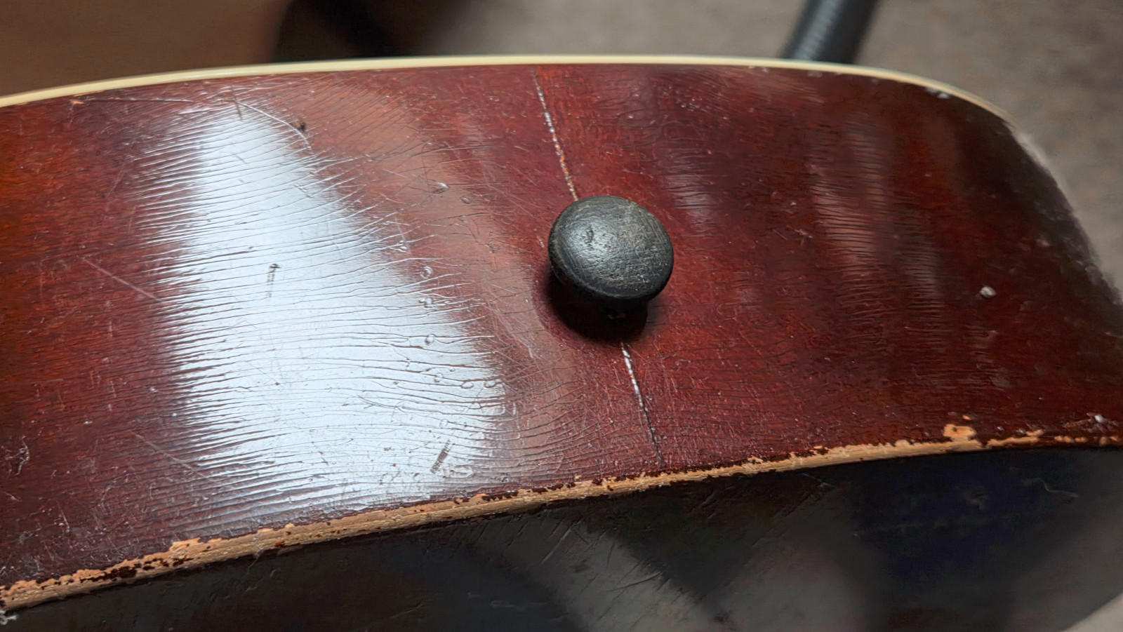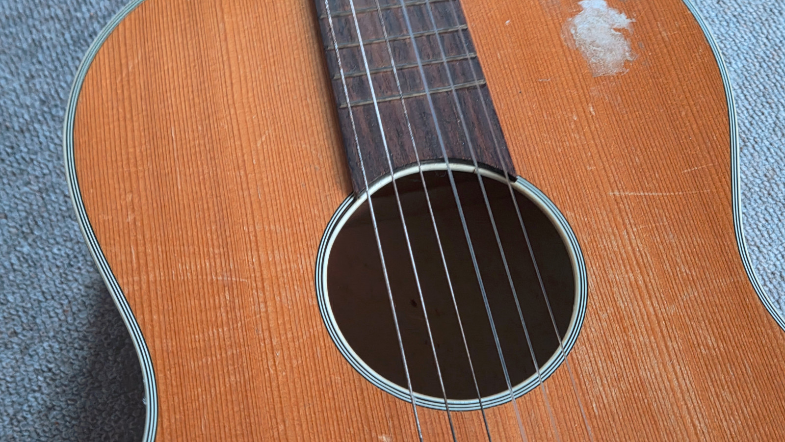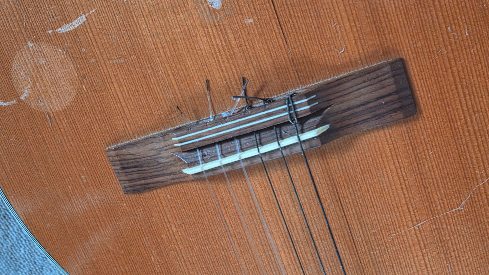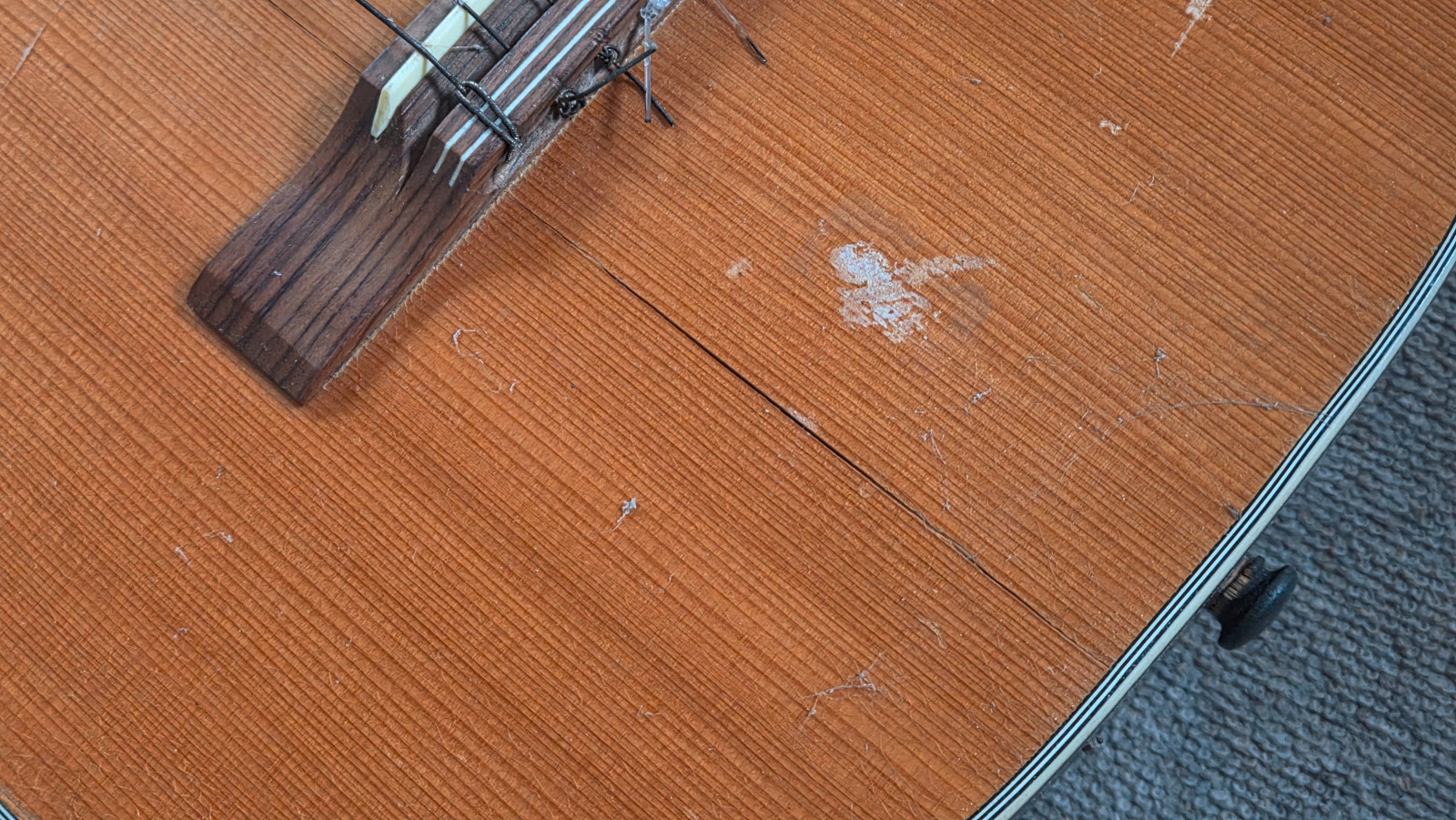Interesting, old guitar in need of repair! No label to be found, but there is a number inside: "4461" (maybe it was made April 1961?) It once was sold by "Musikhaus Wiech, Reutlingen" (south of Germany, close to Stuttgart) The neck is staight. There is a crack at the front , and the furnish showes scretches. (see photos) The overall length is approx. 97,5cm/ 38 3/8nches, the body has 48cm/ 18 7/8 inches. it is 33,5 cm wide at the lower bout. The nut has 4,5 cm. The guitar needs repair, service and cleaning. Shipping to USA or Canada is 65$, international bidders welcome, I ship worldwide! Please also view my other auctions with instruments. Shipping more than 1 instrument would save in shipping.