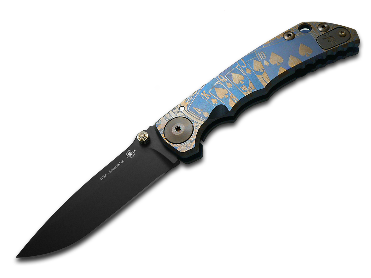 Whether you're searching for authentic cutlery to collect, a top quality knife to give as a gift, or a superior blade to carry, don't pass this one up! It comes complete with a Lifetime Limited Manufacturer's Warranty. This knife utilizes a 4" Locking Drop Point blade with a plain edge, flat grind, swedge, 3.8mm thickness, thumb studs, and thumb ramp jimping. The blade material is 'Double Deep' Cryo-treated CPM MagnaCut Stainless Steel (61-63 HRC) with a Black PVD coating and William W. Harsey signature. The contoured handle is Bronze Anodized 6AL4V Titanium with Bronzed hardware, jimping, lanyard hole, reversible tip-up pocket clip, and is etched with blue Royal Flush graphic on the front side and Playing Card graphic on the back side. This magnificent piece is 4 3/4 inches long(closed for folding knives) and weighs approximately 5.9 ounces. Spartan BladesĀ® was born out of a vision to create high-quality knives designed for both military and civilian use. The Spartan Blades knife company was founded in 2008 by Curtis Iovito and Mark Carey, two retired U.S. Army Special Forces NCOs with over 40 years of combined military experience. Their dedication to quality and innovation has earned them numerous Blade Show awards.