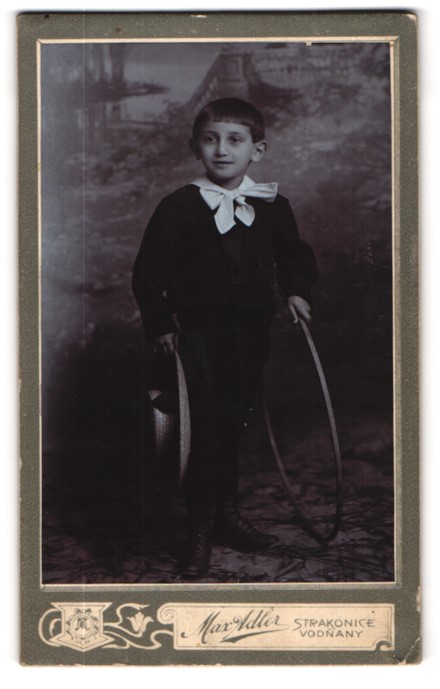 Fotografie Max Adler, Strakonice, Kleiner Knirps mit Strohhut und Holzreifen
