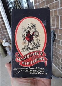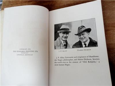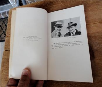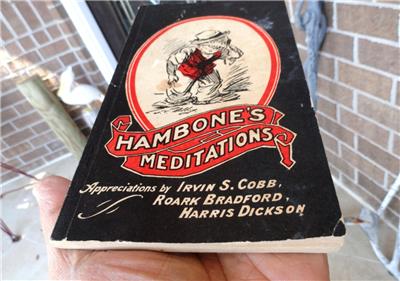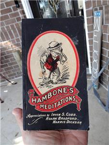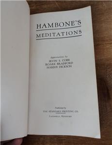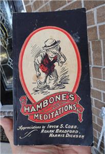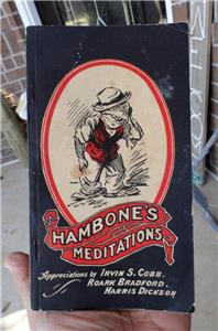 J.P. Alley & Harris DicksonFEATURED: ESTATE FIND - - early HAMBONE’S MEDITATIONS BOOK 1934 Louisville, KY J.P. Alley & Harris Dickson! Measures about 4 ¼” x 7 ½”. Appreciations by: IRVIN S. COBB; ROARK BRADFORD; HARRIS DICKSON. Published by: THE STANDARD PRINTING CO. / INCORPORATED / LOUISVILLE, KENTUCKY. An early bookmark was found inside the book: JOSEPH FOX BOOKS / 1724 Sanson St. Philadelphia Lo3*4184.