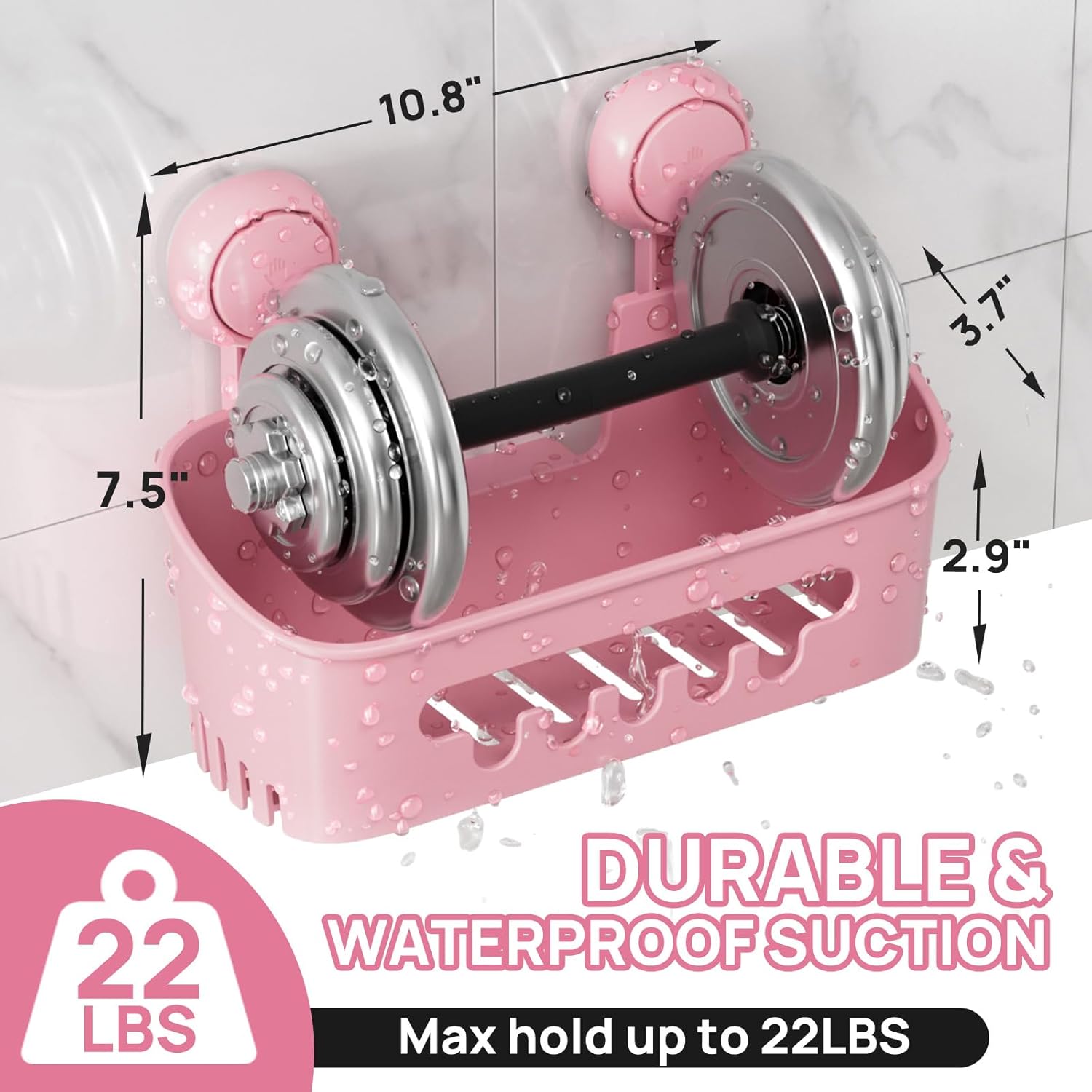 Powerful & Durable Suct: TPE Suct Cup with design of ocus tentacles and ABS plastic Hook s weather proof(-4°F-174°F),waterproof,oil-proof and anti-aging; with thien plastic can hold up to 10KG / 22 lbs and sti sturdy for years after installat without any concerns. The dimens of the small shower basket is 10.8 * 3.7 * 2.9 inch (L*W*H),and the lar shower basket is 12 * 4.7 * 3.4 inch (L*W*H)