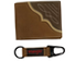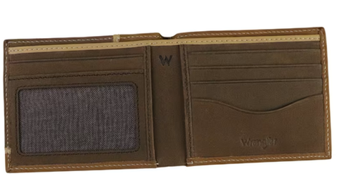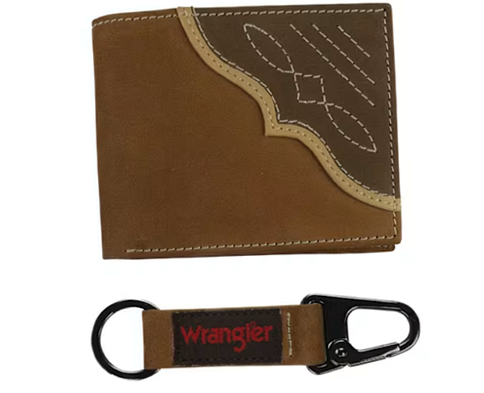Designed for men who appreciate rugged style and functionality, the Wrangler Bifold Wallet with Keychain set includes a brown leather bifold wallet and a matching keychain. The wallet features multiple card slots to organize credit cards and IDs efficiently, along with a mesh ID window for easy display. A spacious cash pocket accommodates bills securely. The signature stitching on the wallet is inspired by traditional Western boot patterns, adding an authentic touch to its design. The accompanying keychain includes a carabiner-style clip on one end for quick attachment to belts or bags, and a traditional key ring on the other to hold keys securely. Crafted from quality materials, this set is built to withstand daily use while maintaining its classic Western aesthetic. Ideal for personal use or as a thoughtful gift, it blends practicality with timeless style.