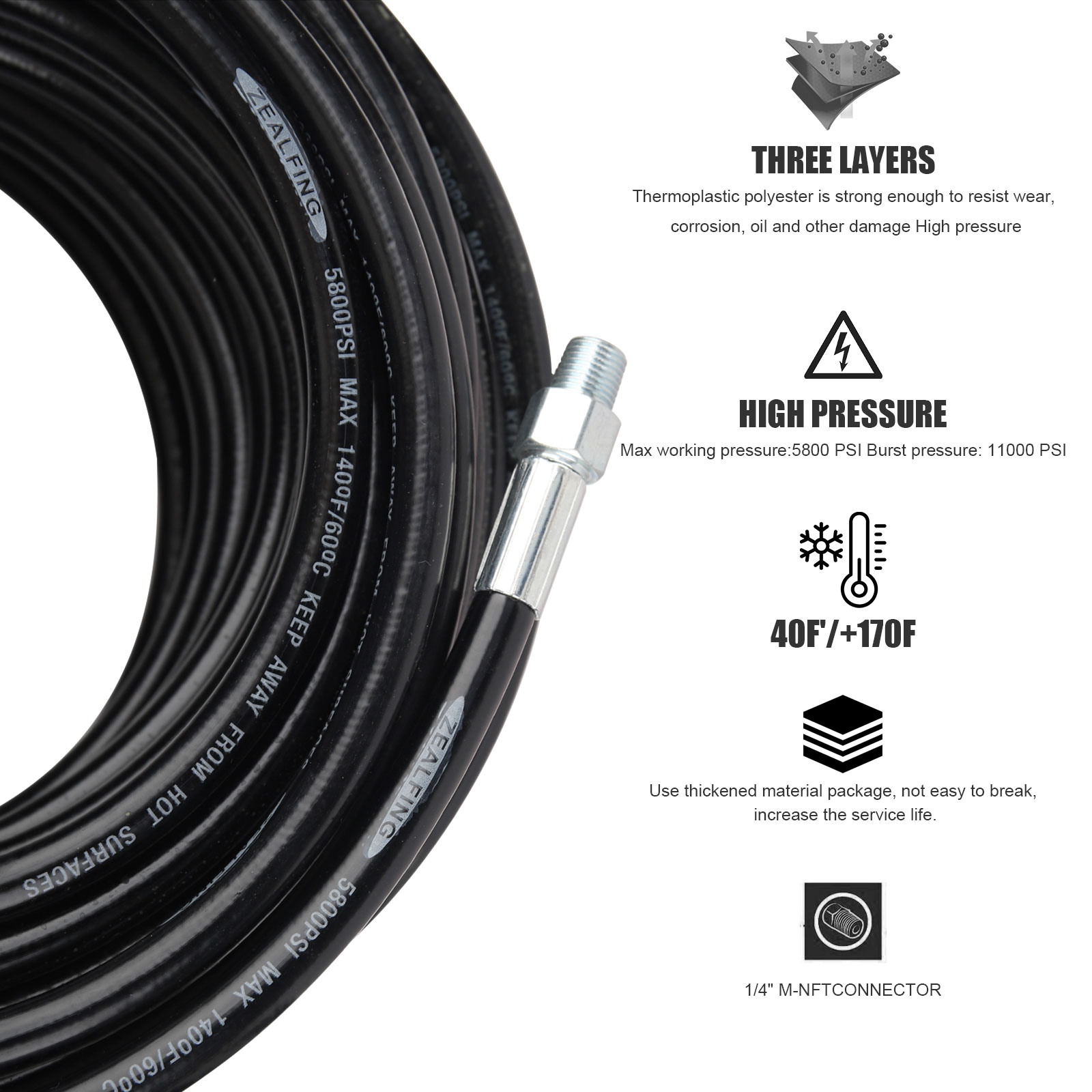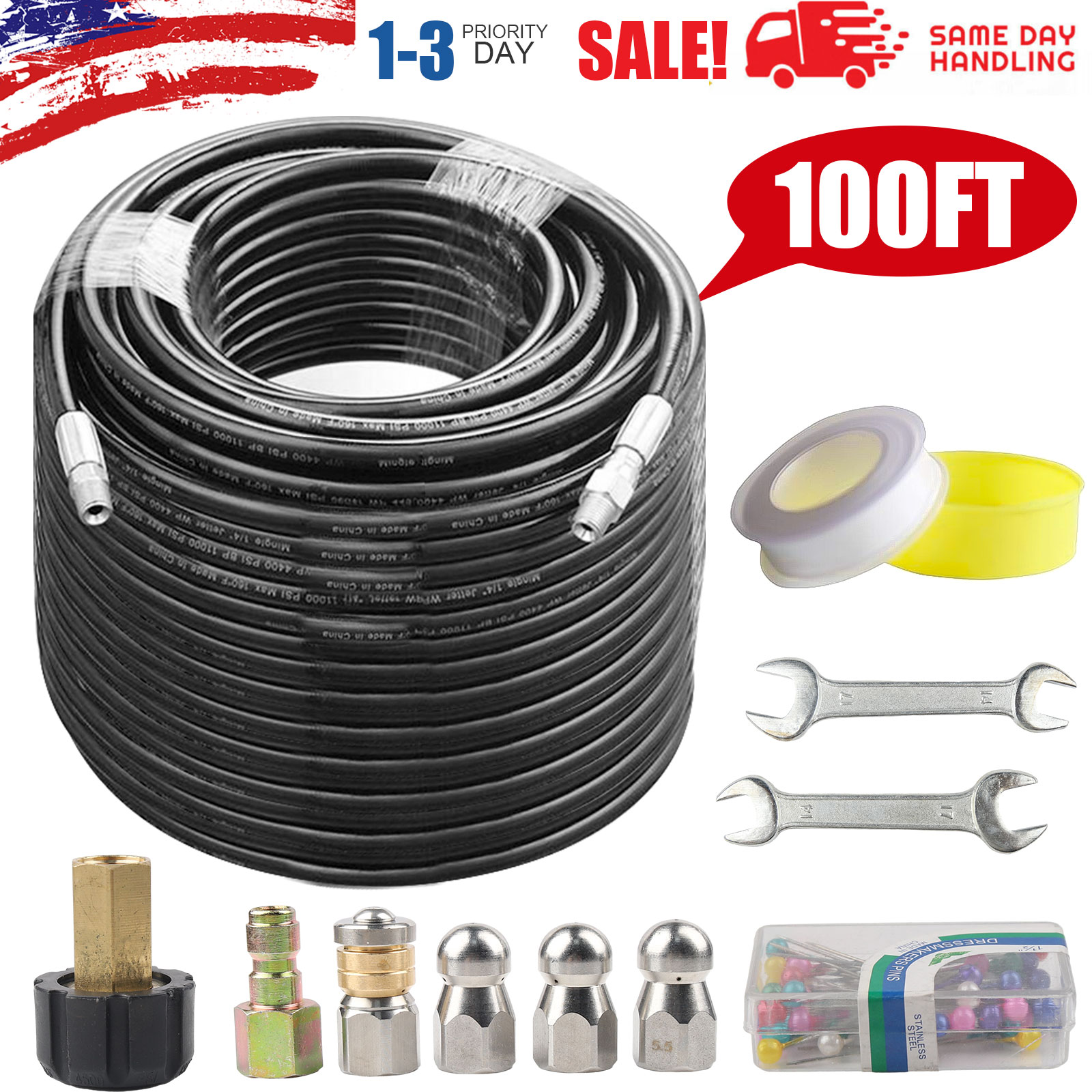 Strong & Durable: 100FT reinforcement Sewer jetting hose. Our hoses are universal with many gas-powered and electric pressure washers up to 5800 PSI. The reinforcement layer is a chemically bonded 1/4" high strength polyester textile weave. The cover layer is made of thermoplastic polyurethane and is resistant to weather, oil, abrasion and ozone. The sewer kit clears blockages without the need for special liquids.