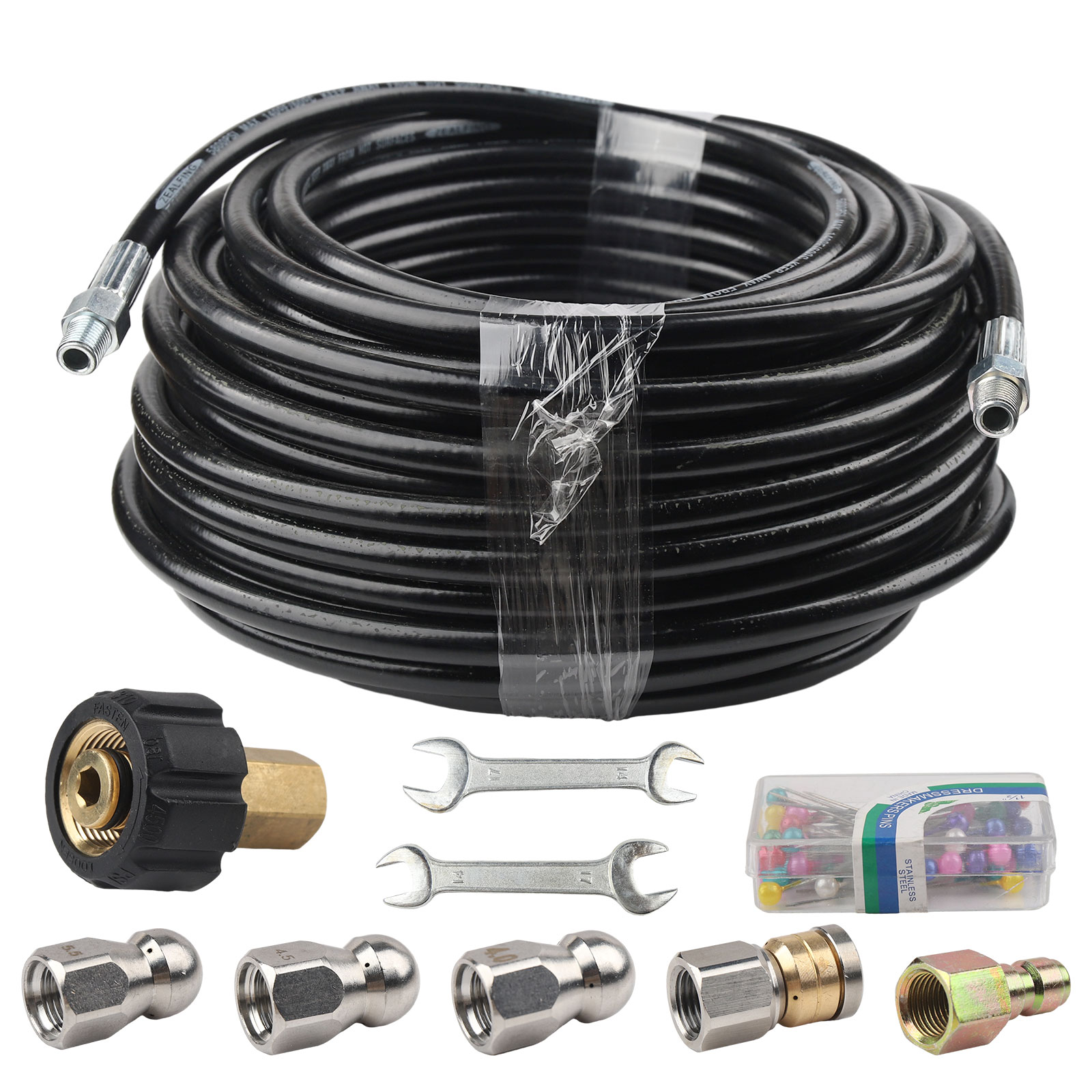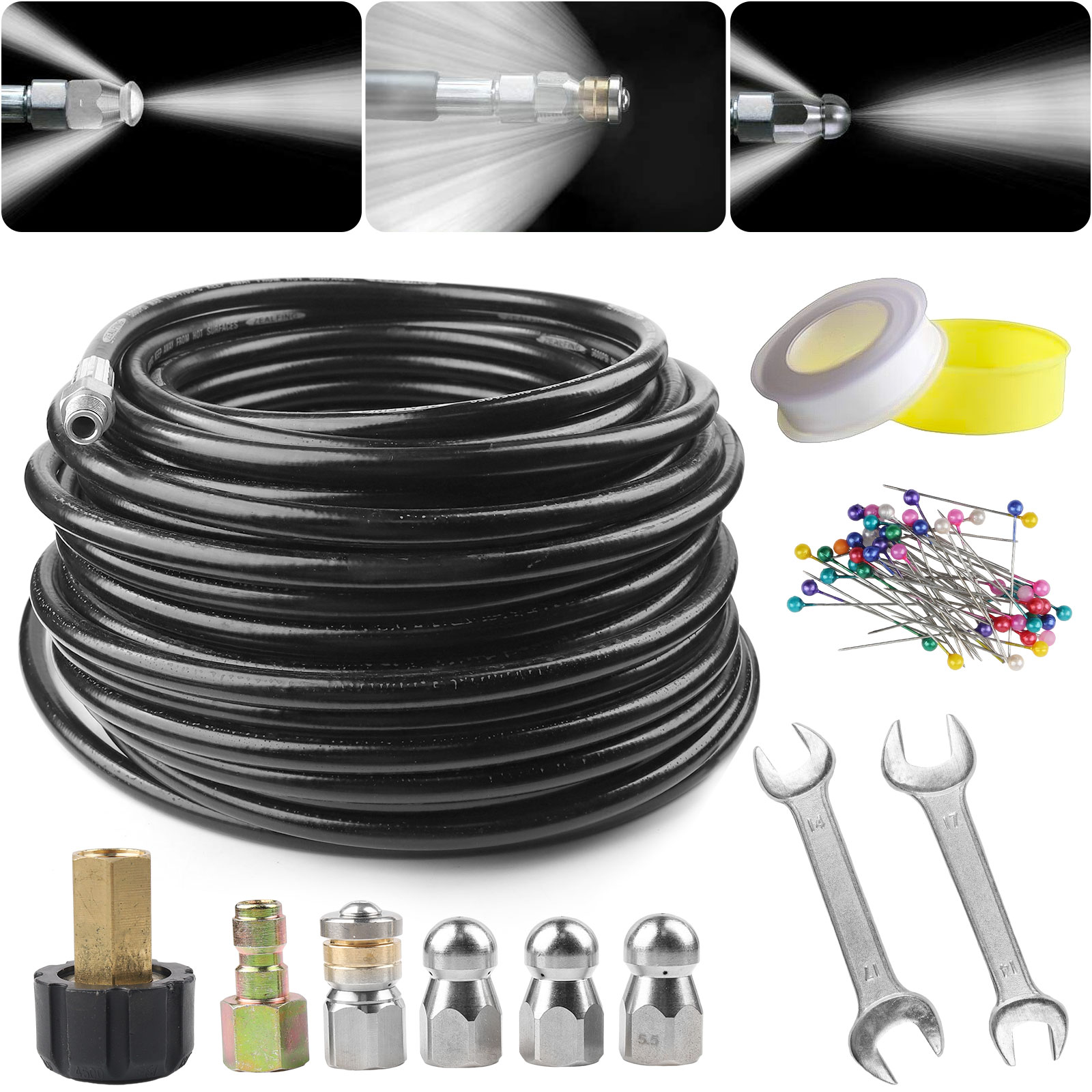 Widely Usage: Our pressure washer hoses can be used to clean cars, motorcycles, floors, windows, driveways, roofs, siding, gutters, bathrooms, outdoors, indoors, etc. Kit includes one hose, 6 of the most common nozzles, 2 spanner, a box of pearl corsage pin, a waterproof tape. Spanners to install nozzles or couplers, pearl colored pins to help clean clogged nozzles, and waterproof tape to help prevent leaks. The hose is designed to have a small outside diameter that allows the hose and nozzle to fit through sewer lines and pipes. Sewer hose is lighter, more flexible and has an outer cover which allows it to slide thru pipes more easily.