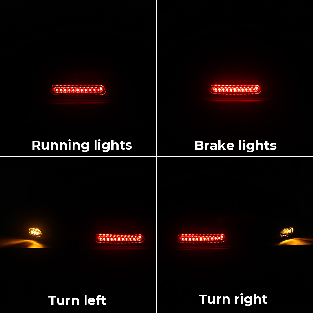 2.The rear fender is equipped with turn signals and tail lights.4 Light Function:Red Running / Brake Light,Amber Turn Signal Light,Flashing Amber Light HAZARD Light.
