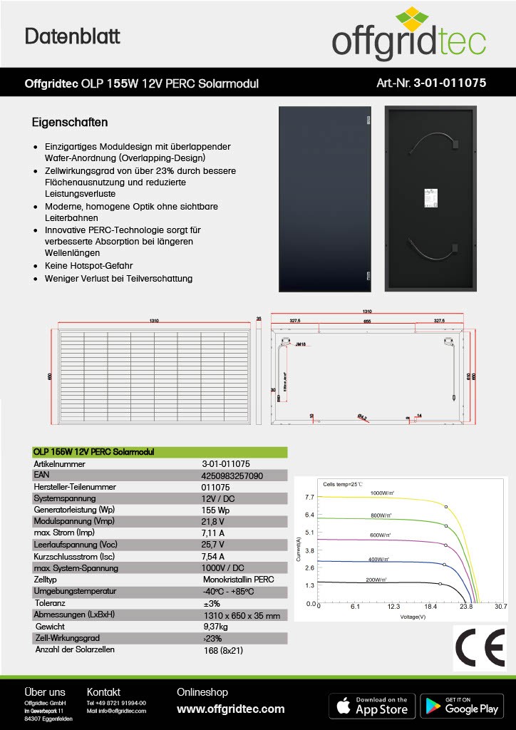 Das Offgridtec OLP 155W (MPN 3-01-011075) ist ein leistungsstarkes 12V Solarmodul mit innovativem Overlapping-Design Wafer-Bestückung und weißt Abmessungen vor, die bis jetzt nur Hochleistungssolarmodule erreichen konnten. Die Schindel-Anordnung der Wafer sorgt für einen optimalen Stromfluss durch minimierte Leistungsverluste und einen deutlich höheren Modulwirkungsgrad durch bessere Platzausnutzung. Die verwendete PERC-Technologie verbessert die Lichtaufnahme und erhöht den Leistungsertrag.