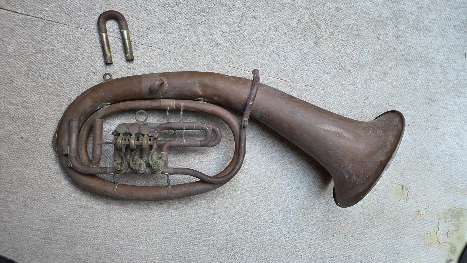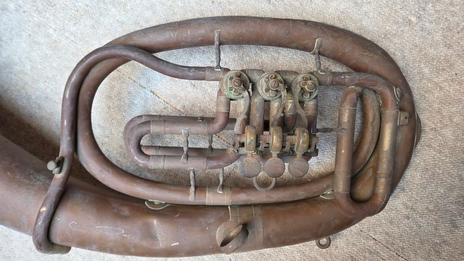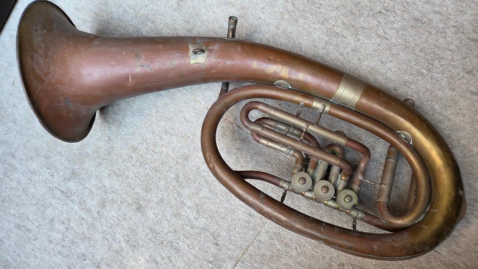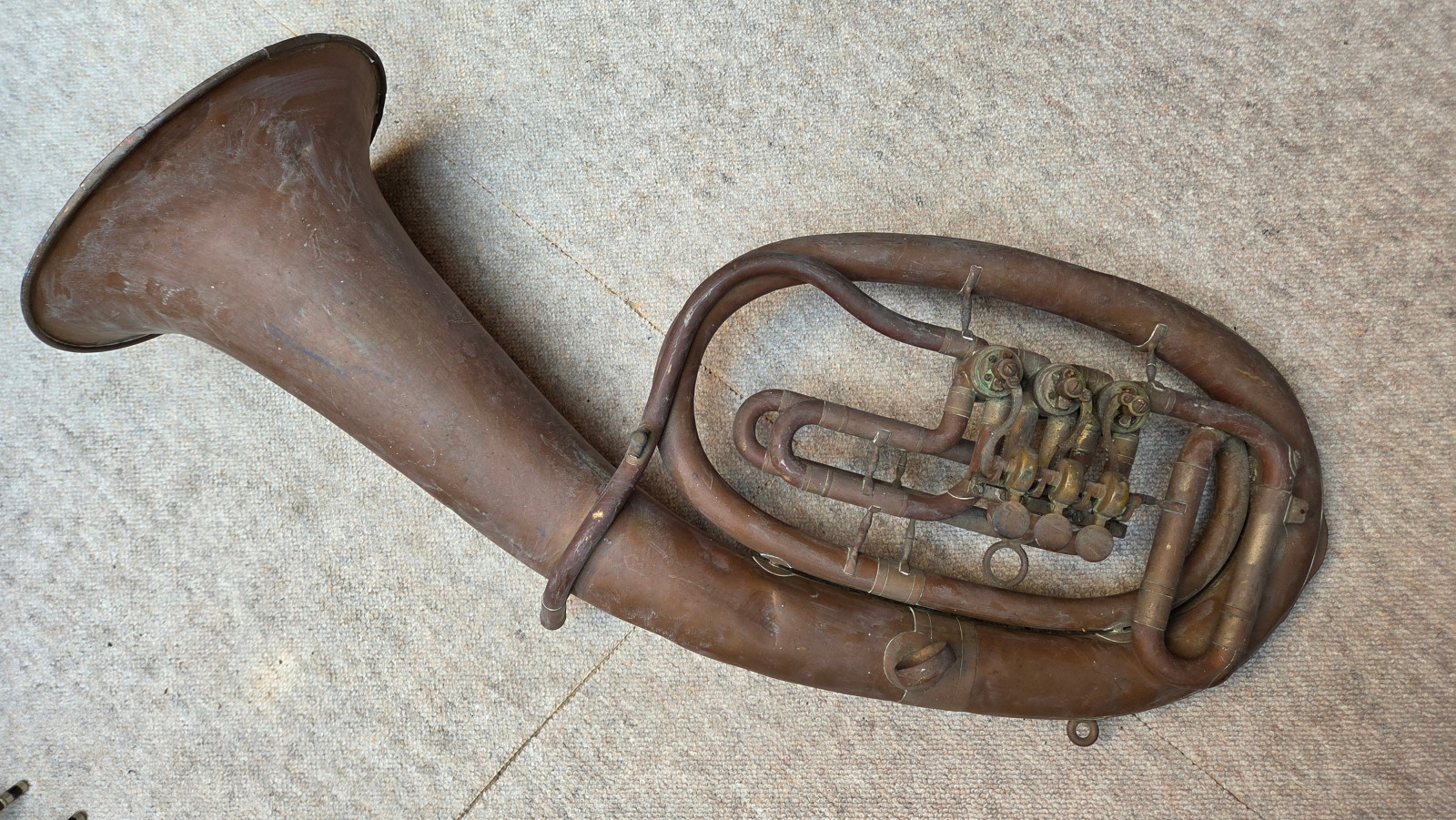 Very old Tuba, Tenorhorn or Bariton (?). It showes dents and bents . I guess it is a Tenorhorn in bb. No makersname to be found. Only one of the slides is moveable. The valves are moveable, but not easy and fast (need cleaning and oil) The waterkey is missing. There are some old repair patches. Size of the horn is approx. 26,5 inch/67cm. The bell meassures approx. 9,5inch/24 cm. The tubing from mouthpice to bell meassures aprox.292cm/ 119 3/4nches. Instrument needs service & a good cleaning. Please make sure that you see all the photos. Insured shipping to USA or Canada amounts to $ 89. I will ship worldwide! Please also view my other auctions with instruments. Shipping several items saves shippingfees.