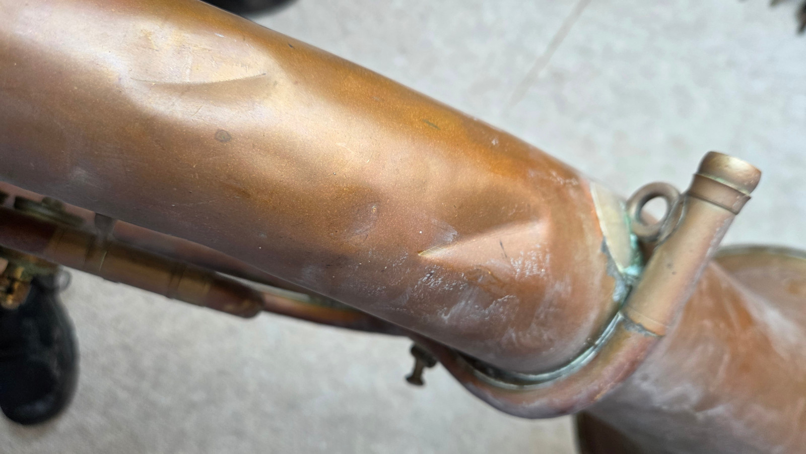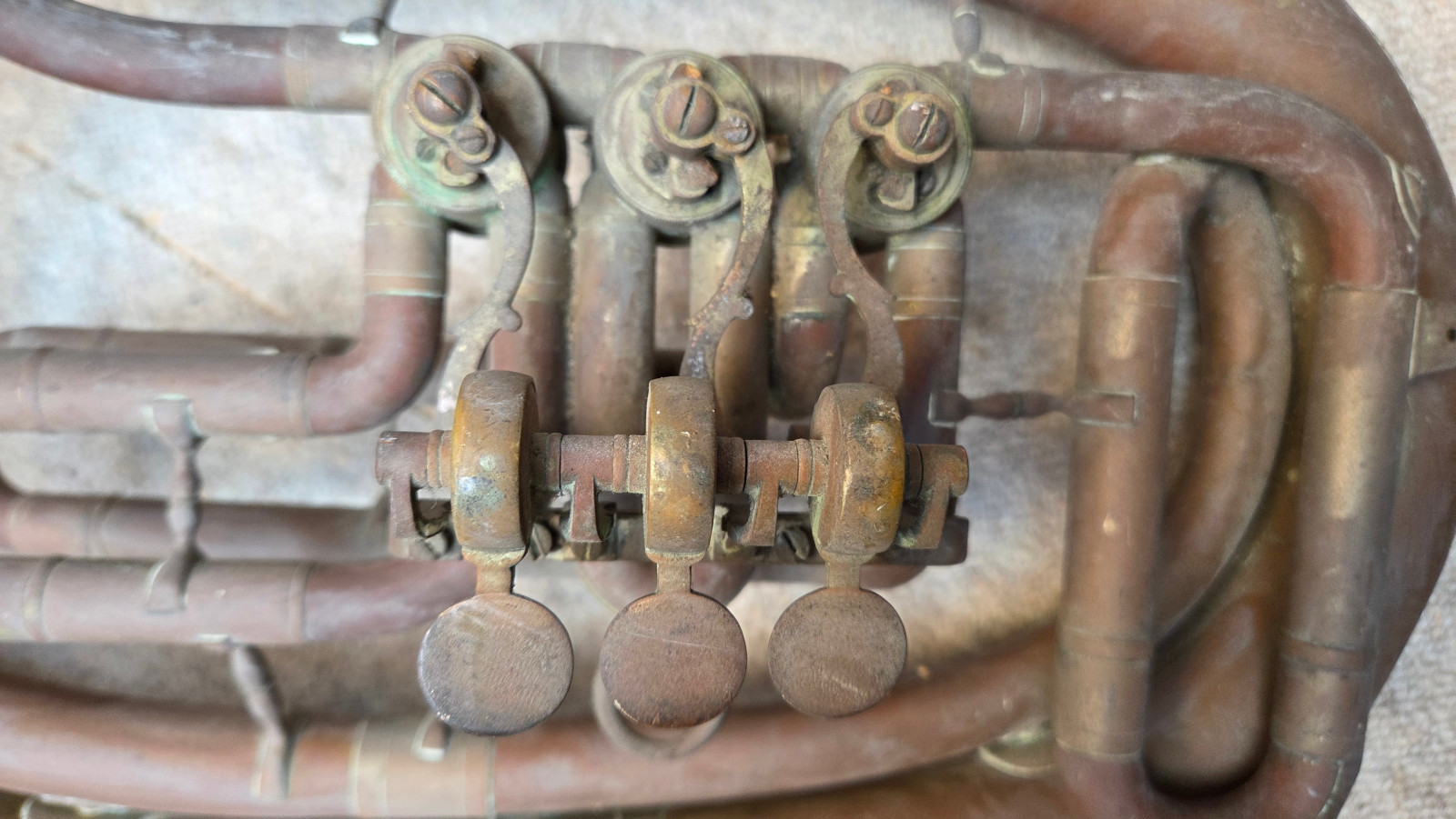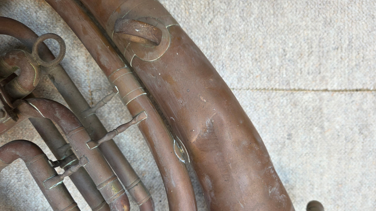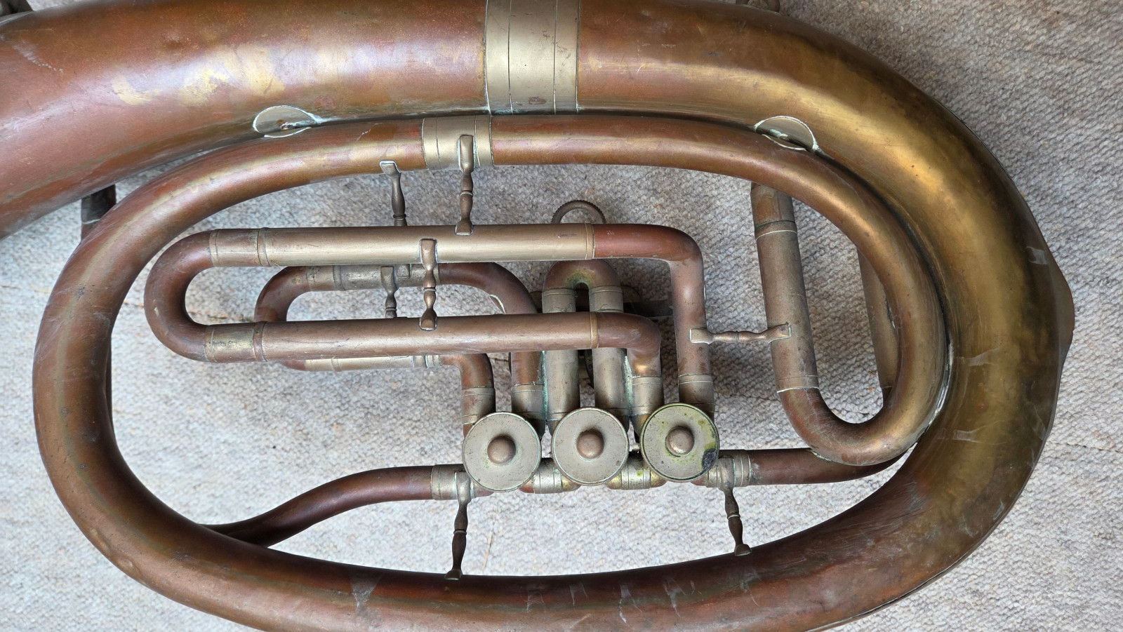 Very old Tuba, Tenorhorn or Bariton (?). It showes dents and bents . I guess it is a Tenorhorn in bb. No makersname to be found. Only one of the slides is moveable. The valves are moveable, but not easy and fast (need cleaning and oil) The waterkey is missing. There are some old repair patches. Size of the horn is approx. 26,5 inch/67cm. The bell meassures approx. 9,5inch/24 cm. The tubing from mouthpice to bell meassures aprox.292cm/ 119 3/4nches. Instrument needs service & a good cleaning. Please make sure that you see all the photos. Insured shipping to USA or Canada amounts to $ 89. I will ship worldwide! Please also view my other auctions with instruments. Shipping several items saves shippingfees.