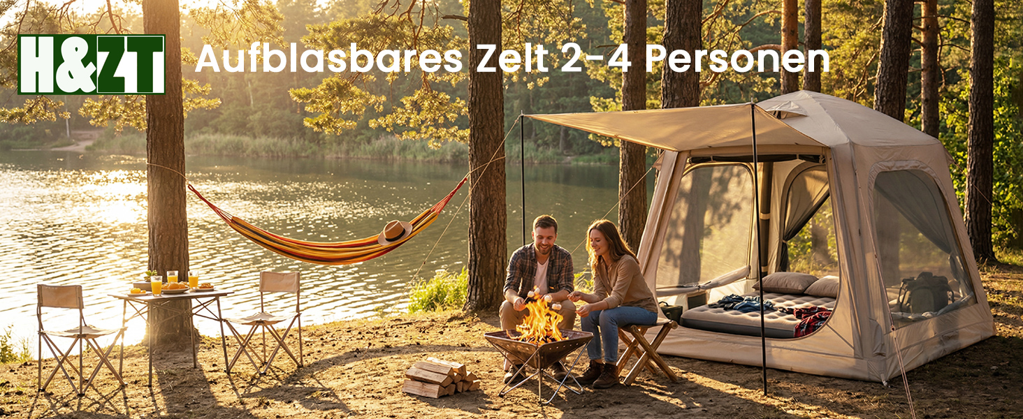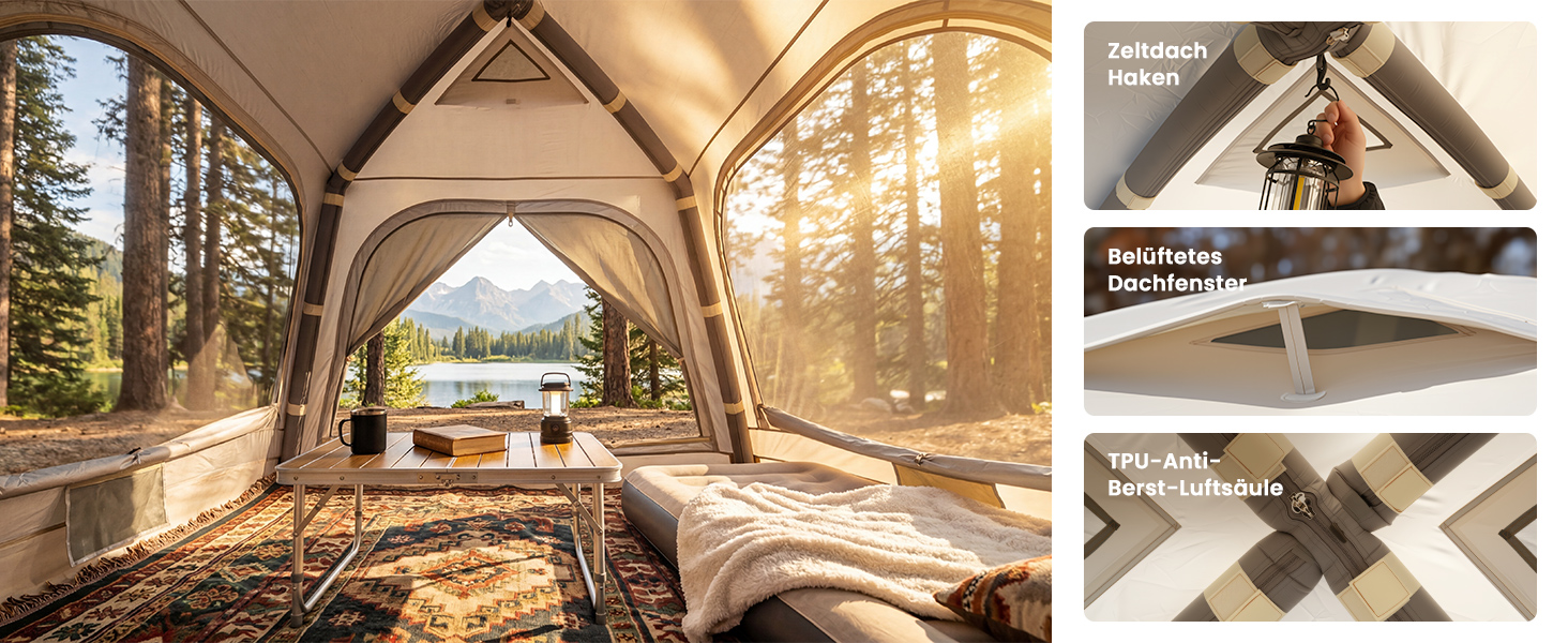 【2 min Einfacher Aufbau Aufblasbares Zelt】Das aufblasbare Campingzelt verfügt über einen innovativen aufblasbaren Balkenrahmen, keine Notwendigkeit für komplexe Stangen; Aufbau und Lagerung sind ein Kinderspiel. Es kommt mit einer Hochdruck-Schnellaufblas-Luftpumpe, und Sie können das Zelt in nur 2 Minuten bereit haben.