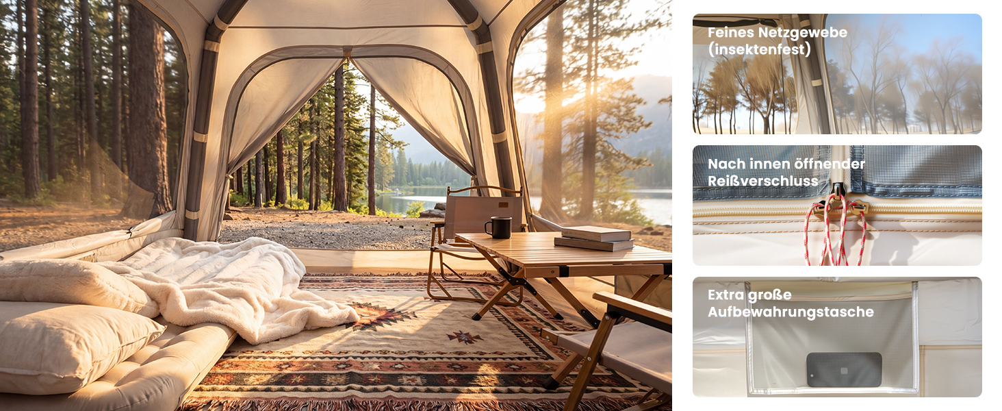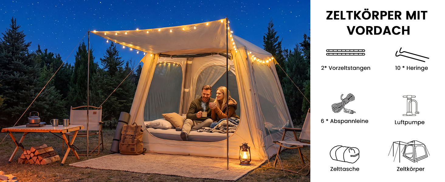 【Glamping Camping Must Have】Inklusive Hochdruckpumpe, verstärkten Heringen, Abspannleinen und Markisenstangen - sofort abenteuerbereit.