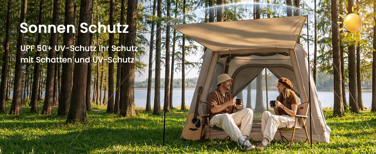 【210D Oxford Fabric】Waterproof PU 3000mm, UPF 50+ Schutz, bietet hervorragenden Sonnenschutz und UV-Beständigkeit. Höhere Zeltstangen für mehr Bewegungsfreiheit, und das campingzelt mit Vordach - Die doppellagige Tür lässt sich in ein Vordach umwandeln.