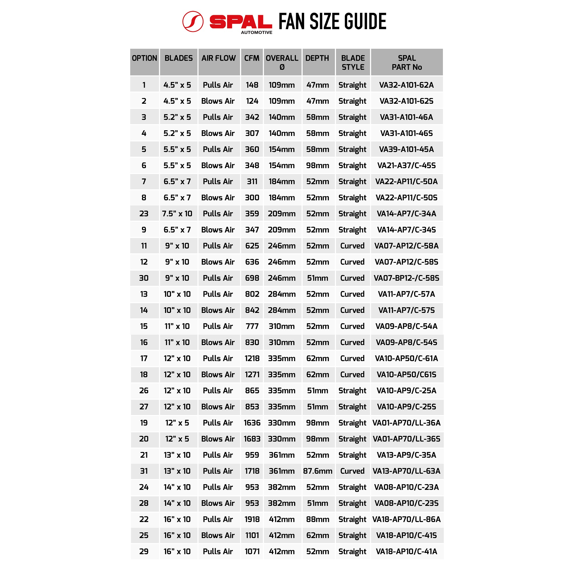 All listed fans are for 12v operation. 24v versions are available please call or email for details. To find the correct Spal fan for your application see the chart below and