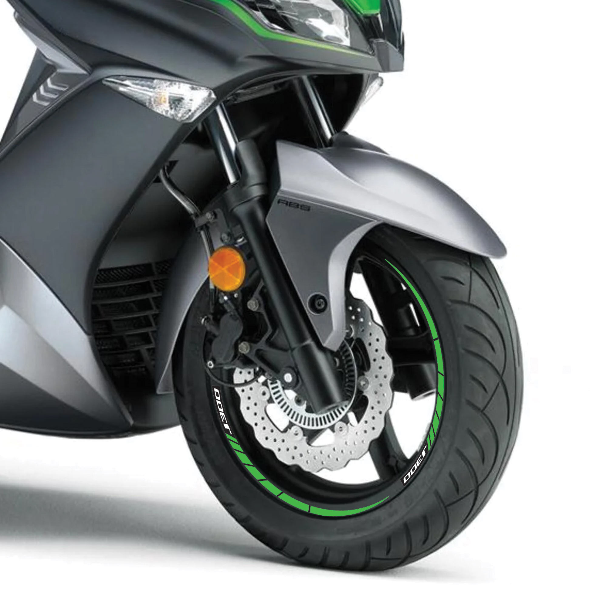 Adesivi per entrambi i cerchi moto 14 - 13 pollici, MADE IN ITALY. Grafiche con base in colorazione verde. Decorano e migliorano l'estetica della tua Kawasaki J300, resistono a lavaggi, intemperie ed ai Raggi U.V.