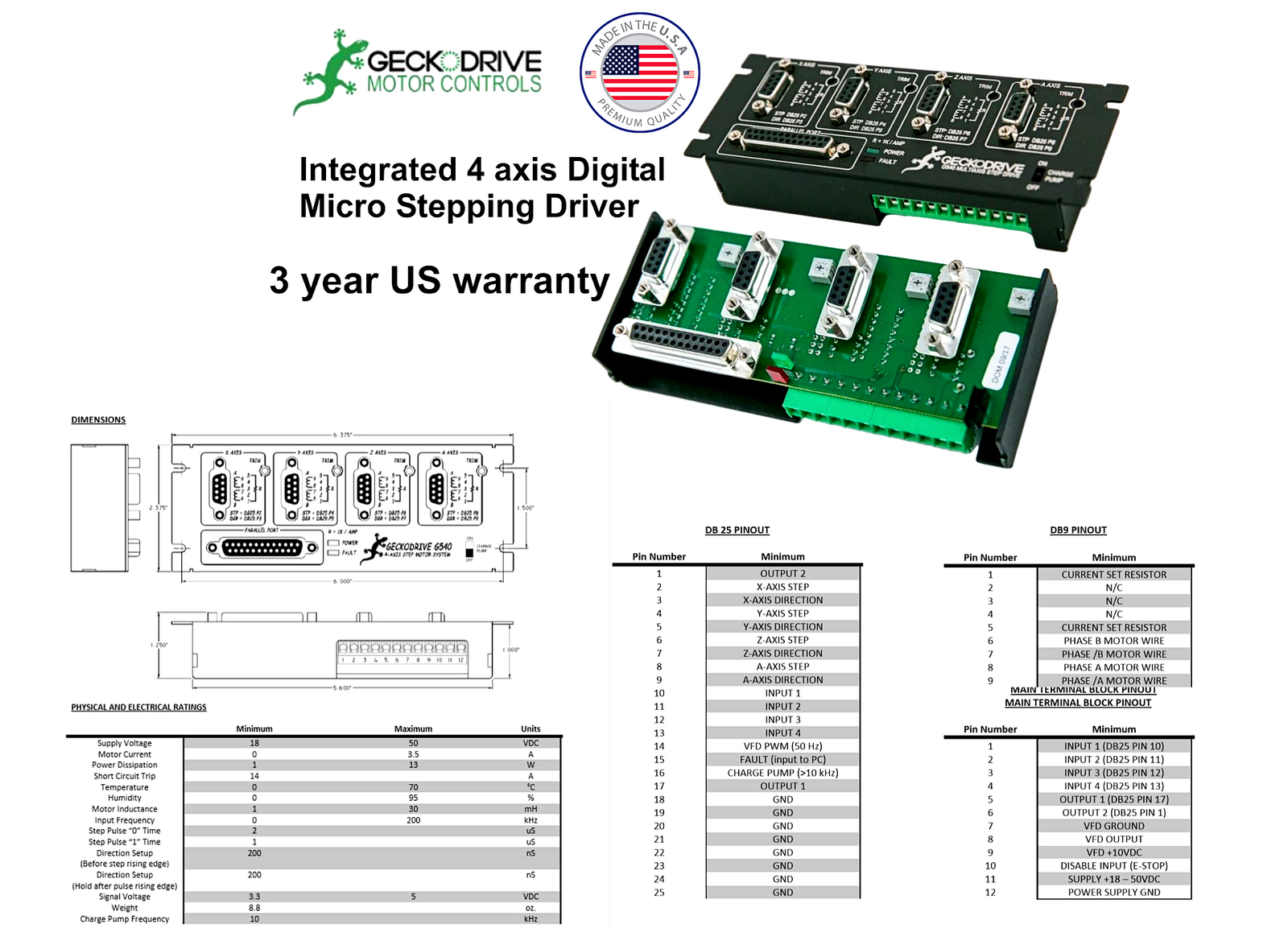This listing includes a Gecko Drive G540 Integrated Digital 4 Axis Micro Stepping Driver System (REV8 2020 Edition), 48v 12.5a (600w) power supply supporting 110v, and 220v input, three 10ft. 20awg 300v 80c (176f) rated double shielded pre-built motor cables with molded on DB9 male, and female connectors with gold plated pins, E-stop Switch,four snap home/limit switches, and DB25 male to male parallel port communication cable