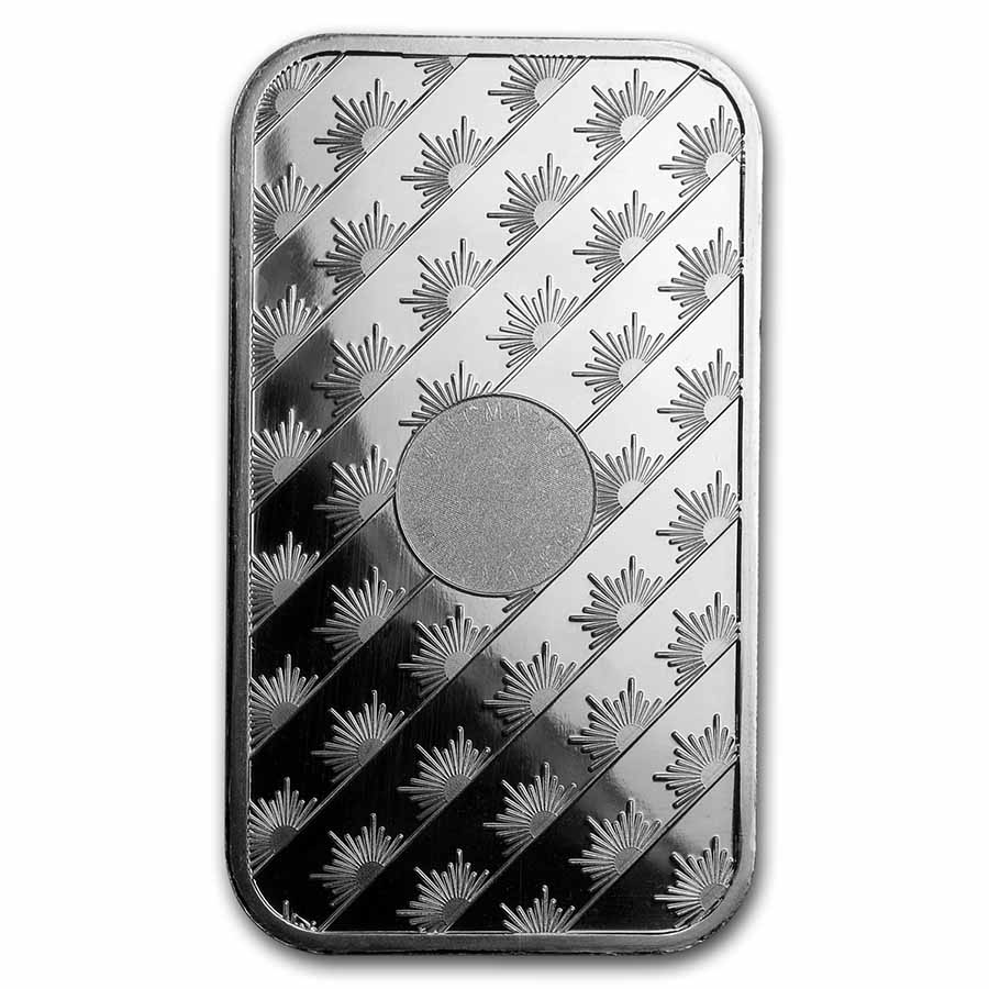 - Obverse: Sunshine Minting eagle with the sun and rays in the background stamped with the purity and weight.